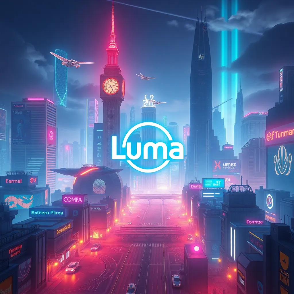Imagine a futuristic cityscape with a sprawling metropolis, neon-lit skyscrapers, and a vibrant atmosphere. In the center, a majestic Luma stands tall, its ethereal wings glowing with an otherworldly light. The city's inhabitants gather around, mesmerized by the Luma's beauty and power. Generate an image that captures this scene.