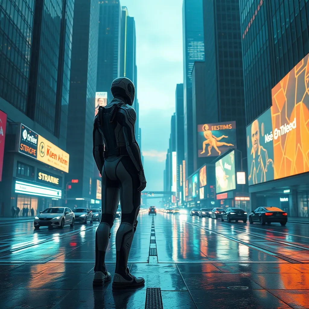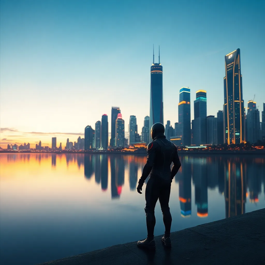 Envision a futuristic cityscape at dusk, with sleek skyscrapers and neon lights reflecting off the wet pavement. The air is filled with the hum of hovercars and the soft glow of holographic advertisements. In the foreground, a lone figure in a futuristic exosuit stands tall, looking out over the city.