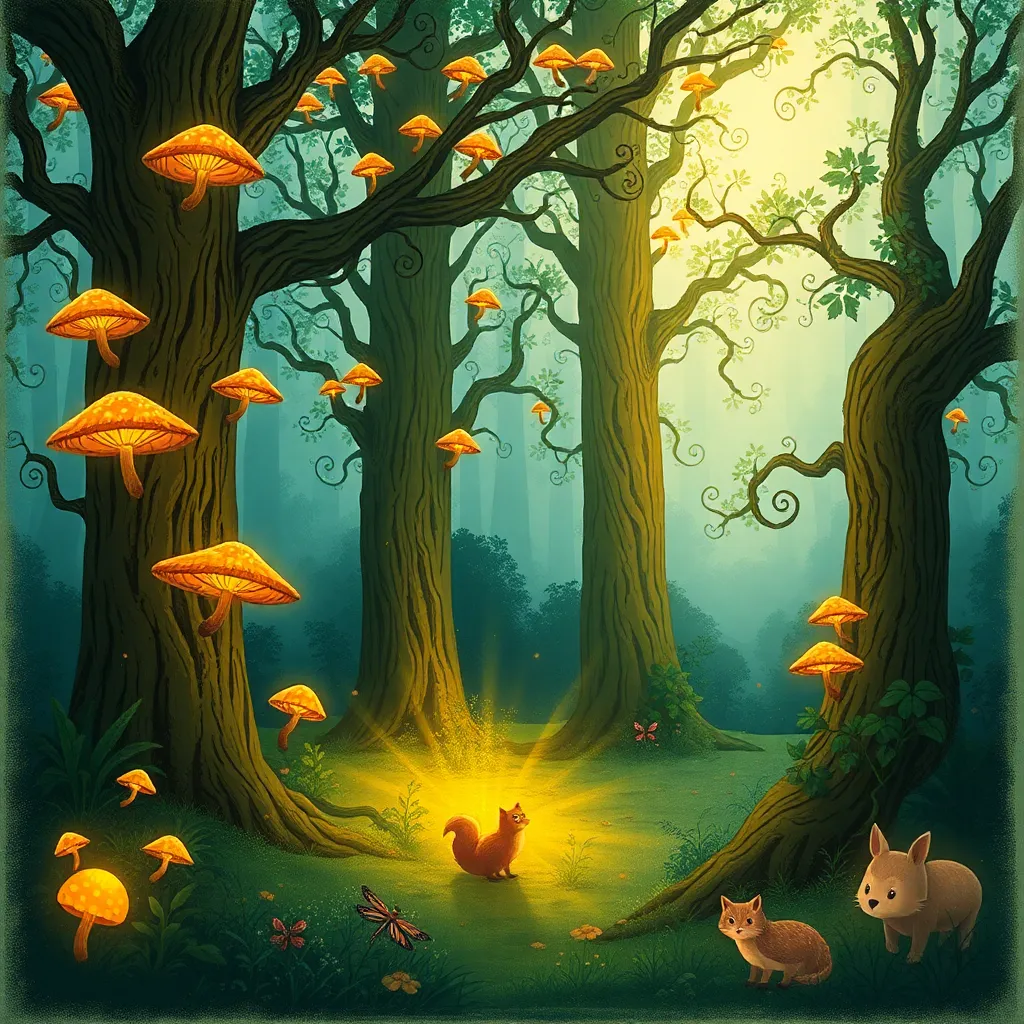 Create an enchanting illustration of a mystical forest at dawn, with towering trees adorned with glowing mushrooms, wispy vines, and a subtle misty fog. Incorporate a few hidden creatures, such as a fox, owl, or dragonfly, amidst the lush foliage, with a warm golden light casting a magical ambiance.