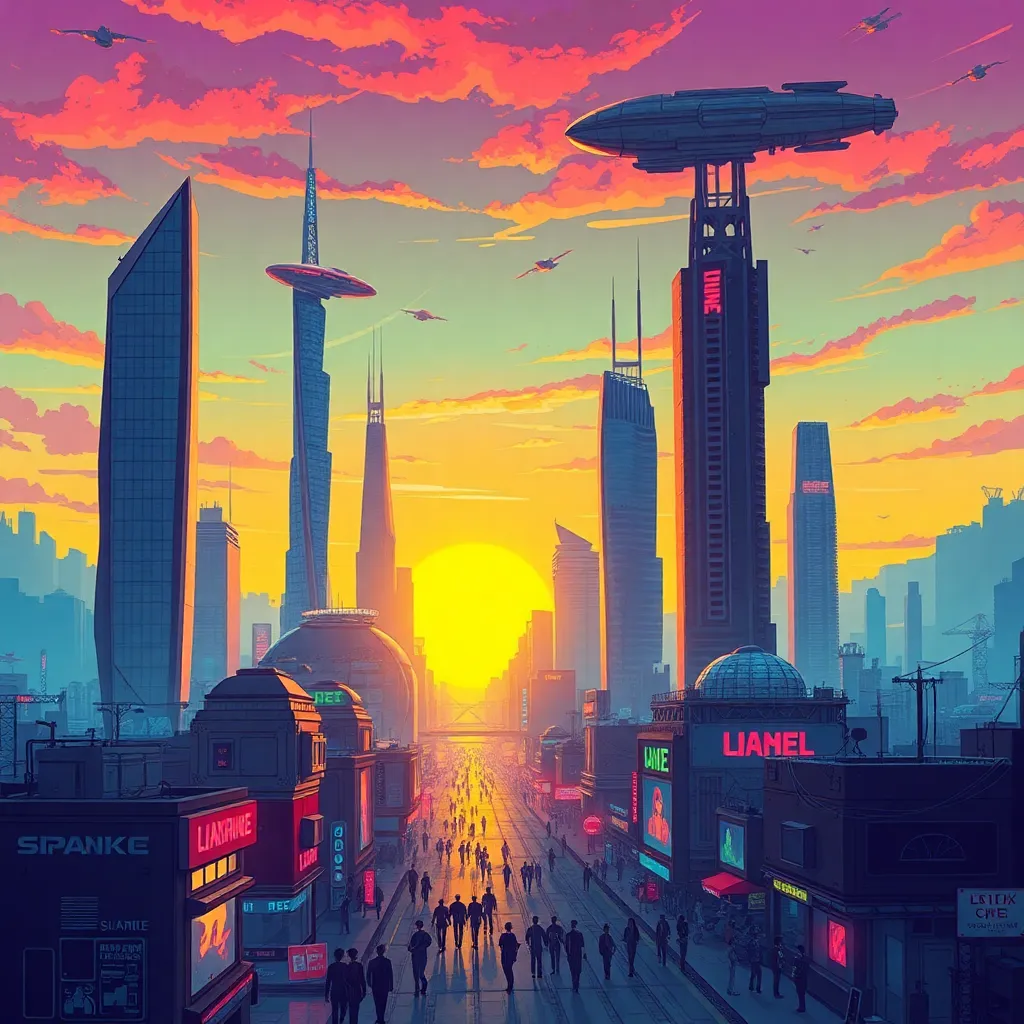 Create an illustration of a futuristic cityscape at sunset, with sleek skyscrapers, neon-lit streets, and hovering airships. Incorporate vibrant colors, dynamic textures, and a sense of energy and movement. The city should be bustling with activity, with people and robots going about their daily lives.