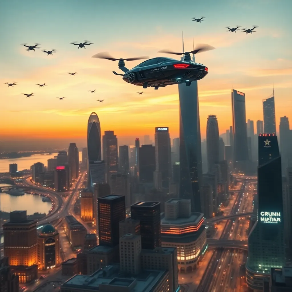 Create a futuristic cityscape at sunset, with sleek skyscrapers and neon lights reflecting off the water. Incorporate a majestic flying car soaring above the buildings, surrounded by a swarm of drones. Add a subtle glow to the city streets, with a sense of excitement and adventure emanating from the scene.