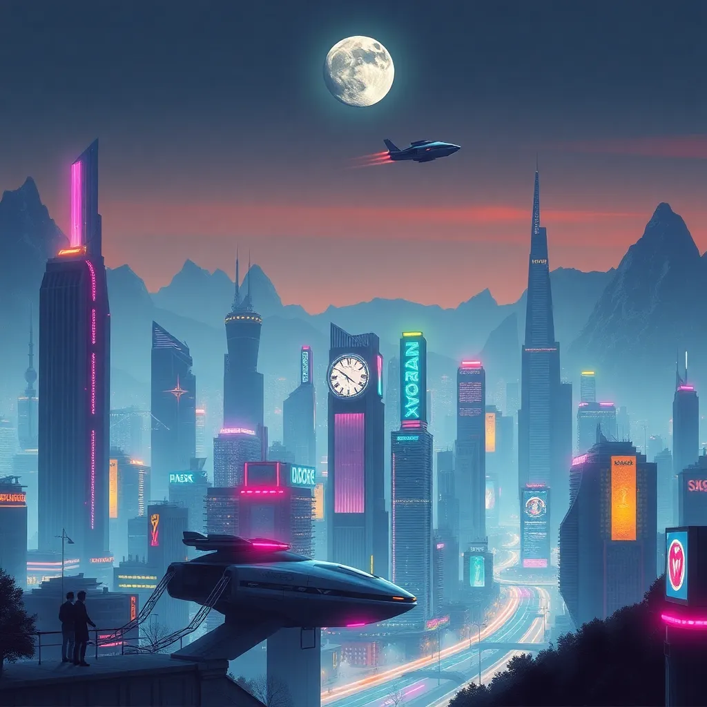 Create a futuristic cityscape with towering skyscrapers, neon lights, and a vibrant atmosphere. Incorporate a prominent clock tower, a hovercar flying by, and a group of people enjoying the city's nightlife. The city should be surrounded by a futuristic landscape with towering mountains and a distant moon.