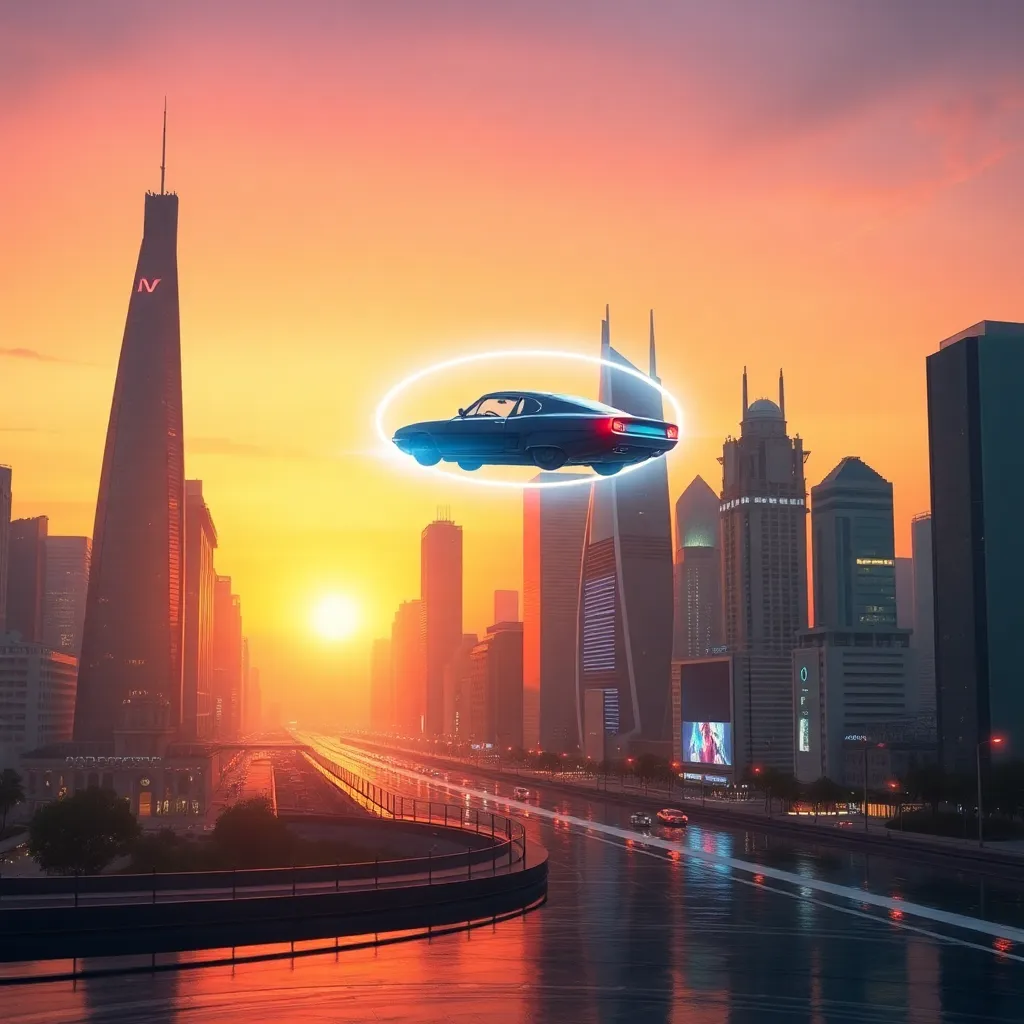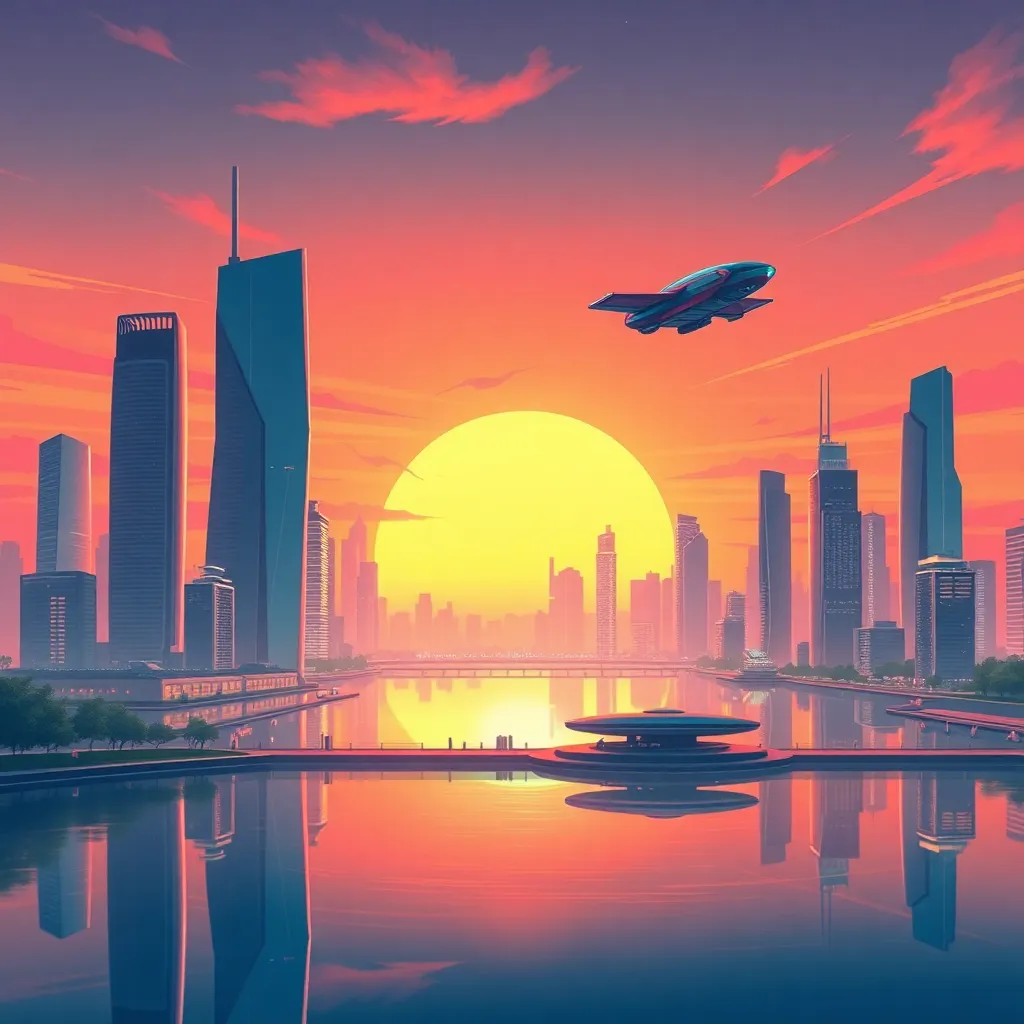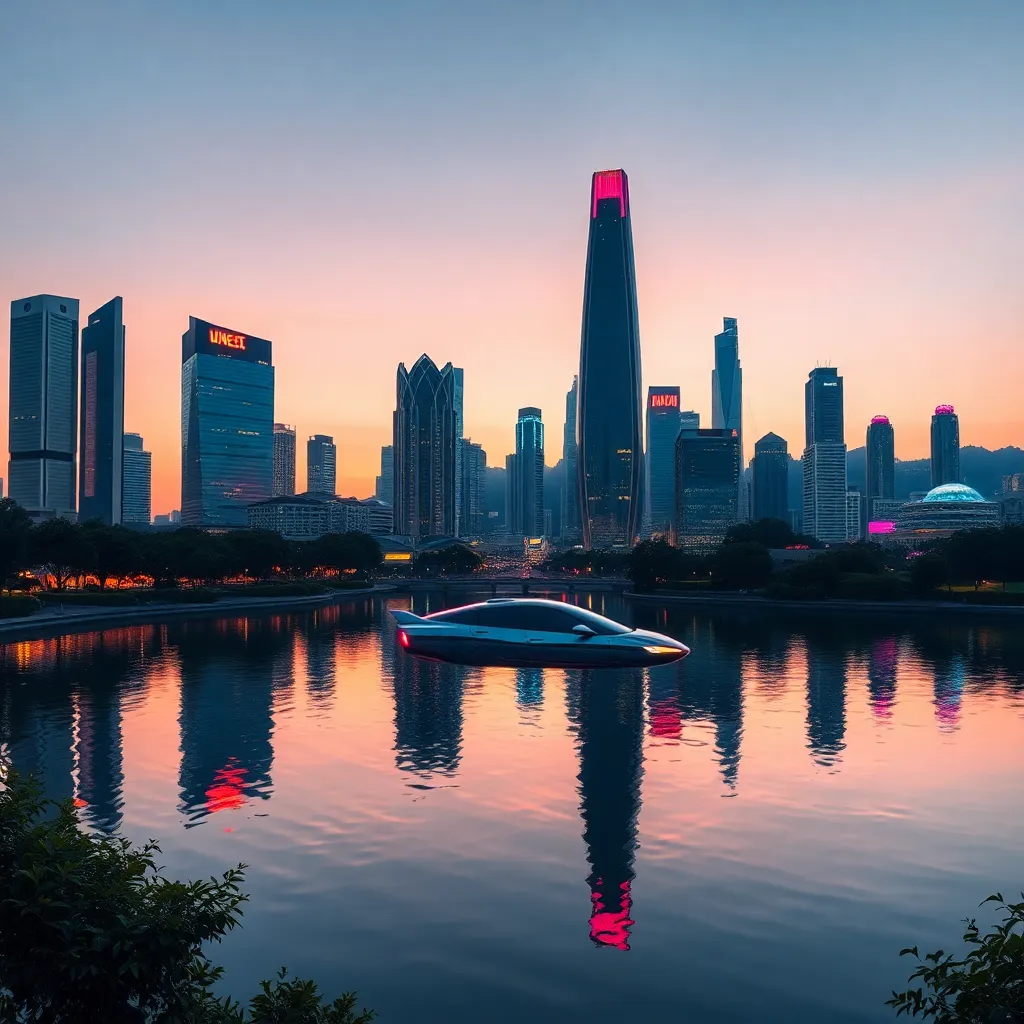 Create an futuristic cityscape at sunset, with sleek skyscrapers and neon lights reflecting off a serene lake. Incorporate a flying car hovering above the water, surrounded by lush greenery and a vibrant cityscape with towering skyscrapers and bustling streets. The atmosphere should be vibrant and futuristic.