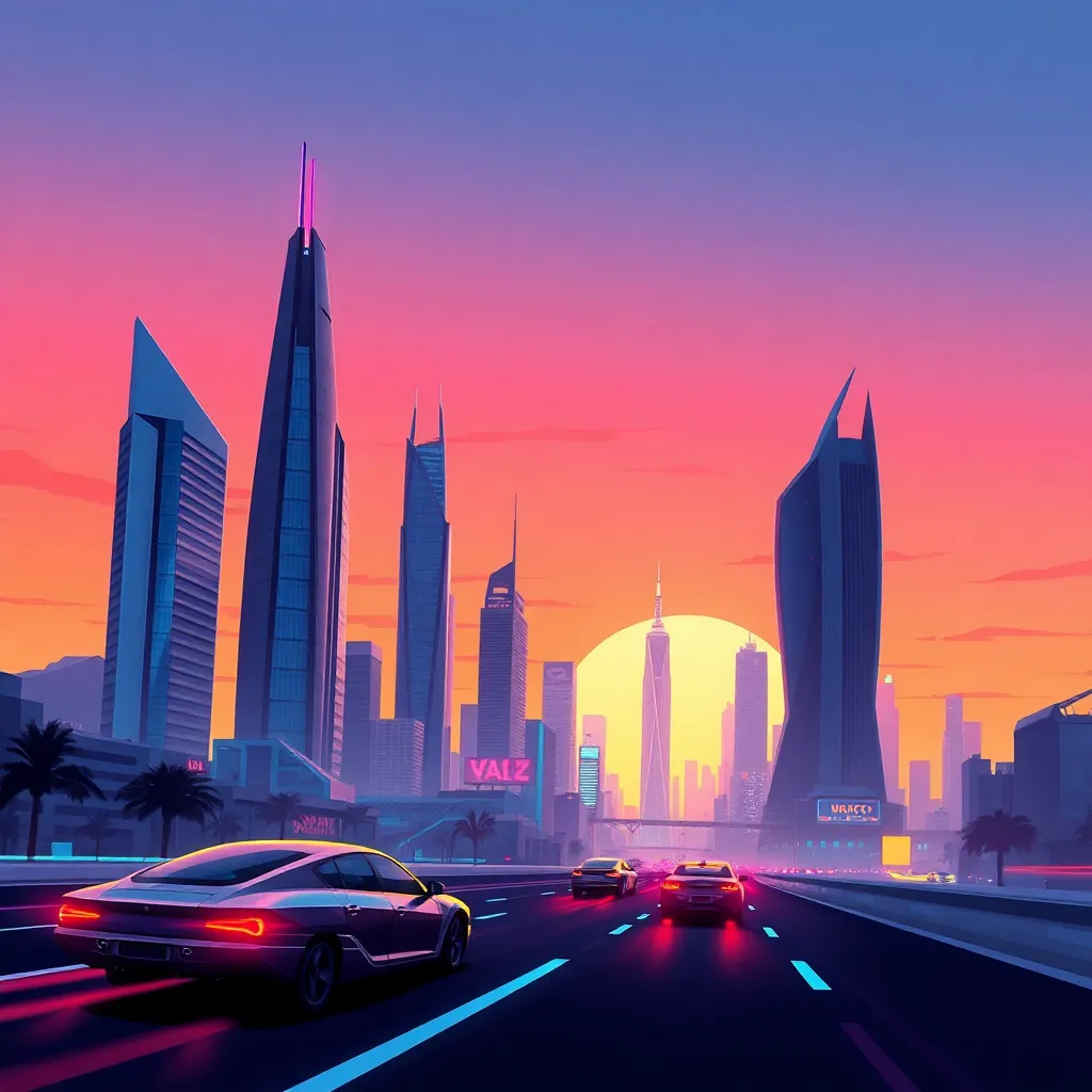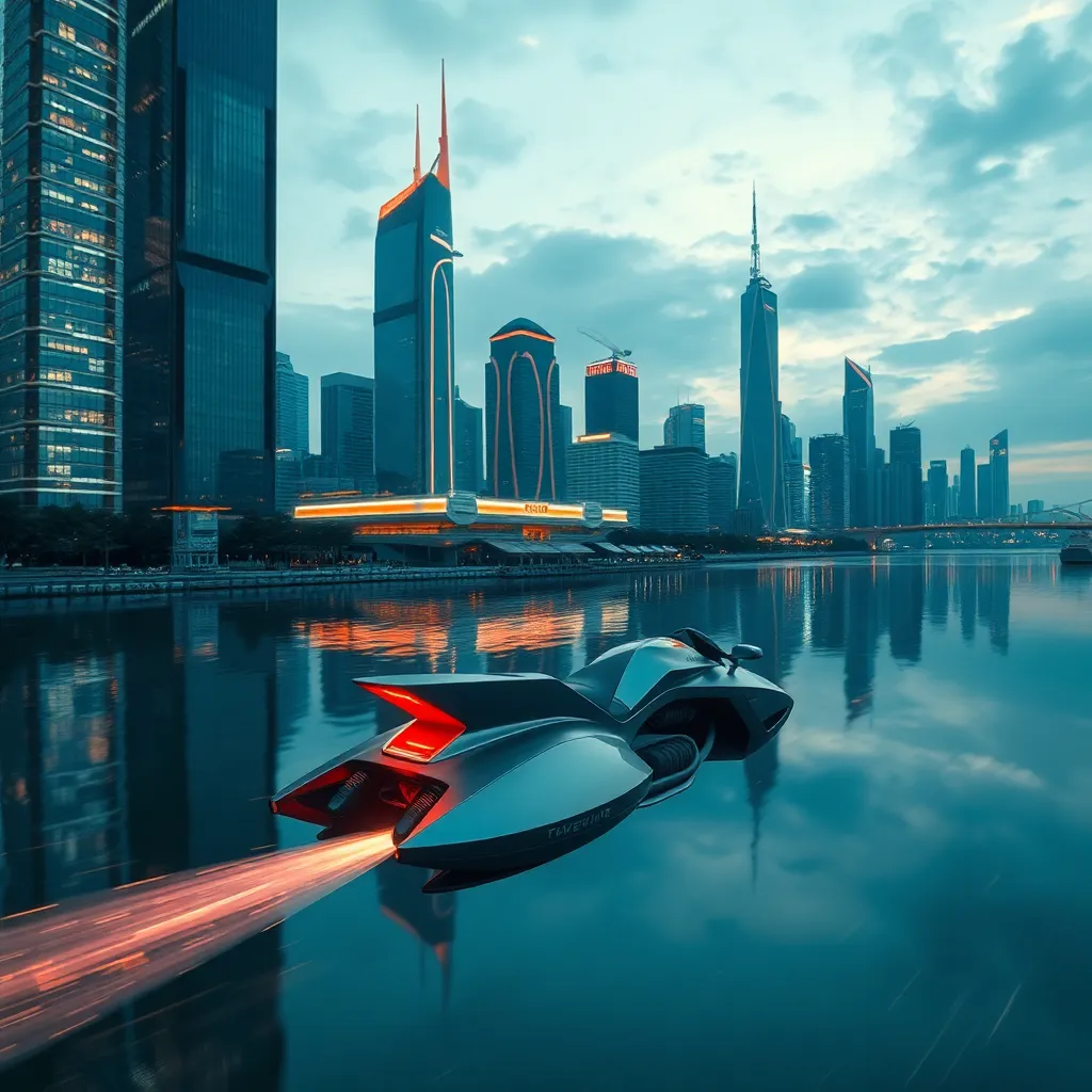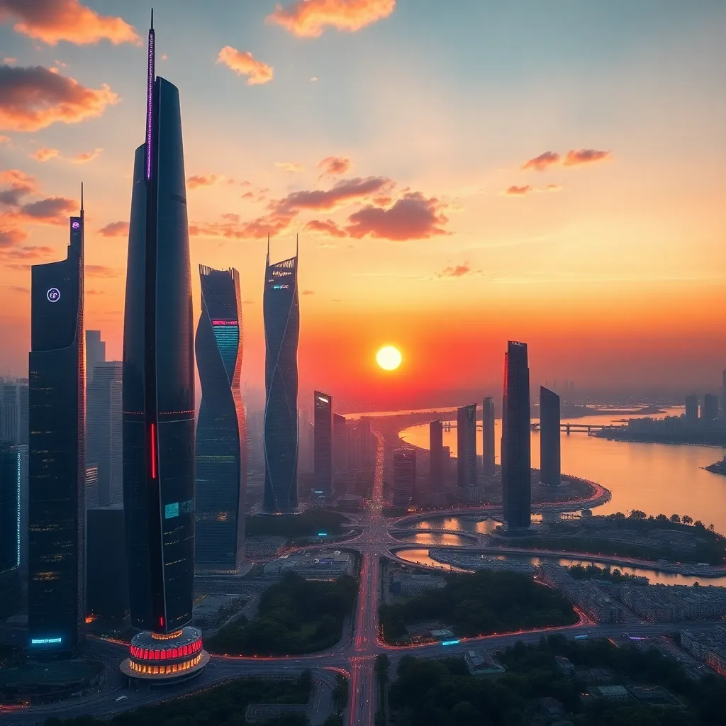 Create an futuristic cityscape at sunset, with sleek skyscrapers and neon lights reflecting off a serene lake. Incorporate a flying car hovering above the water, surrounded by lush greenery and a vibrant cityscape with towering skyscrapers and bustling streets. The atmosphere should be vibrant and futuristic.