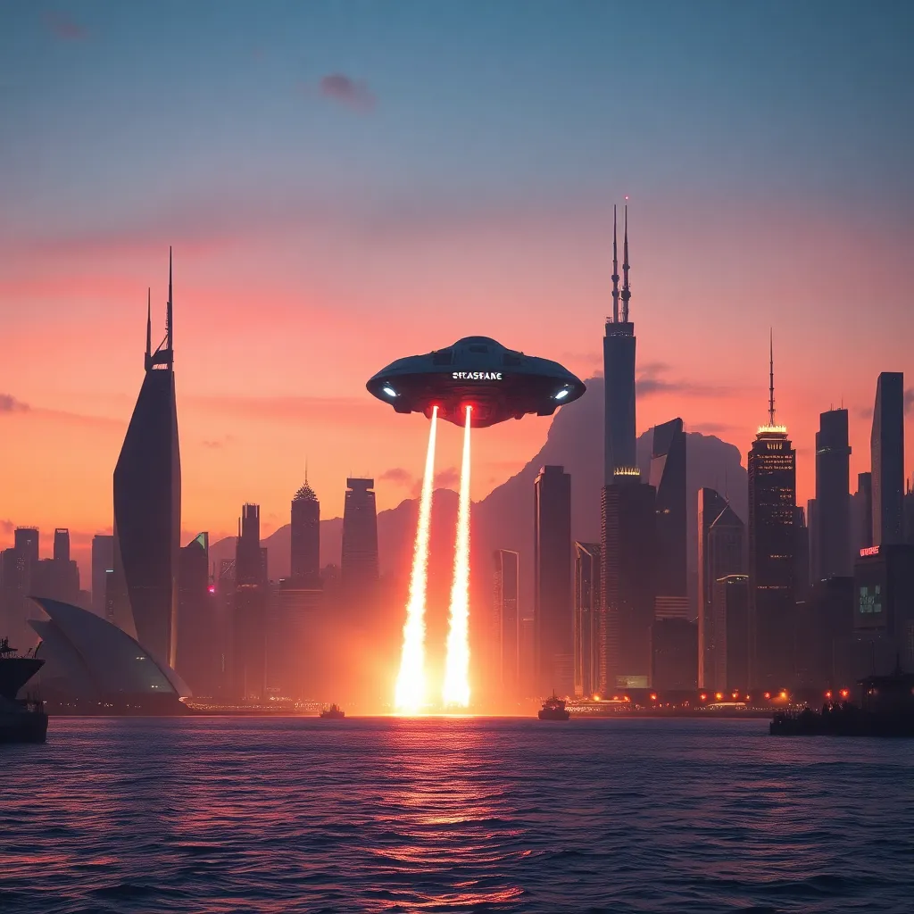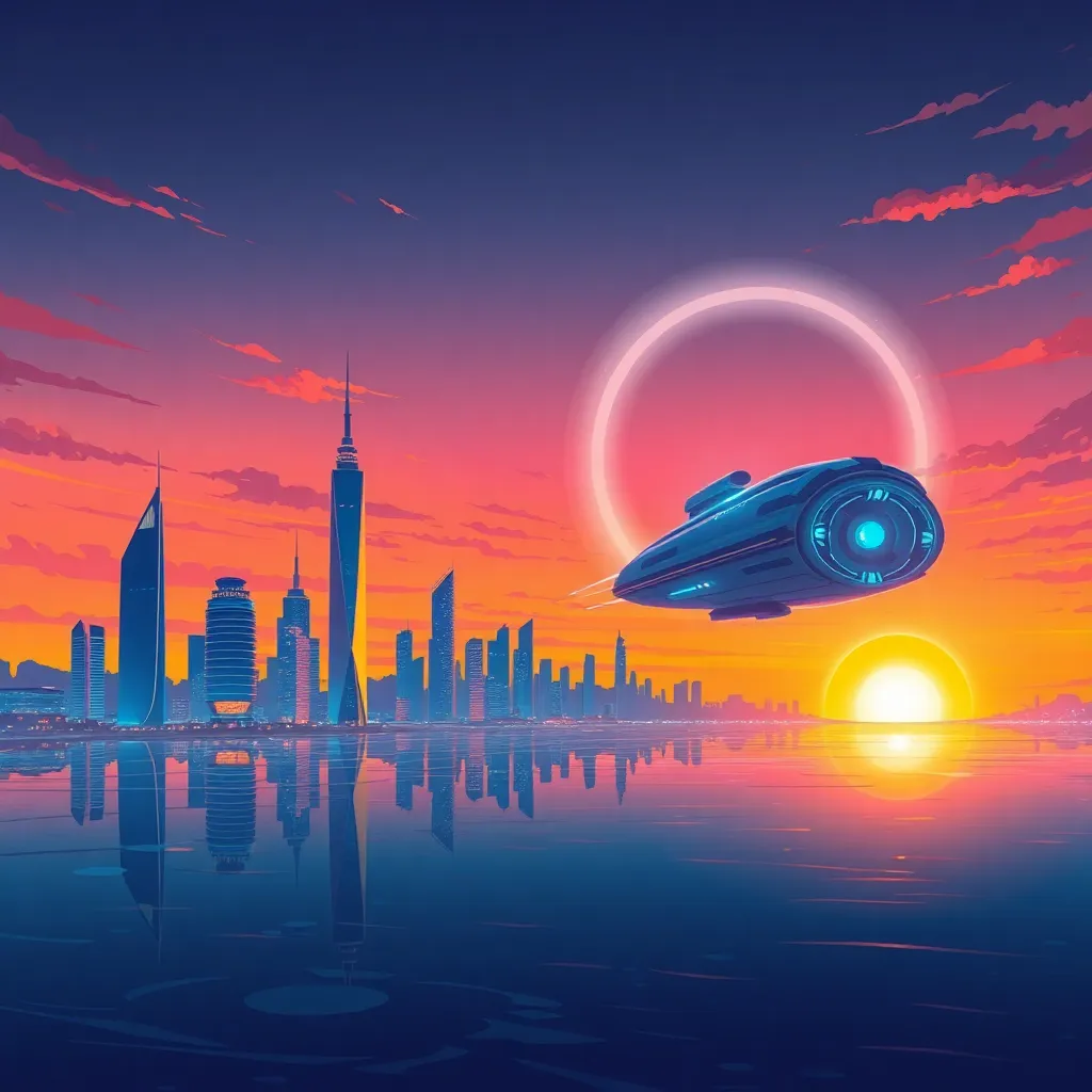 Create an illustration of a futuristic cityscape at sunset, with sleek skyscrapers and neon lights reflecting off a calm ocean. Incorporate a majestic spaceship landing in the distance, surrounded by a halo of light. The atmosphere should be vibrant and dynamic, with a sense of wonder and discovery.