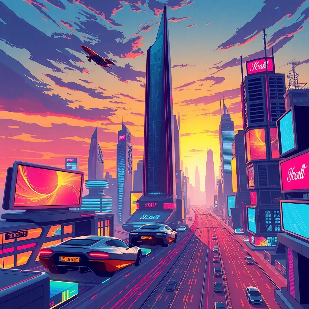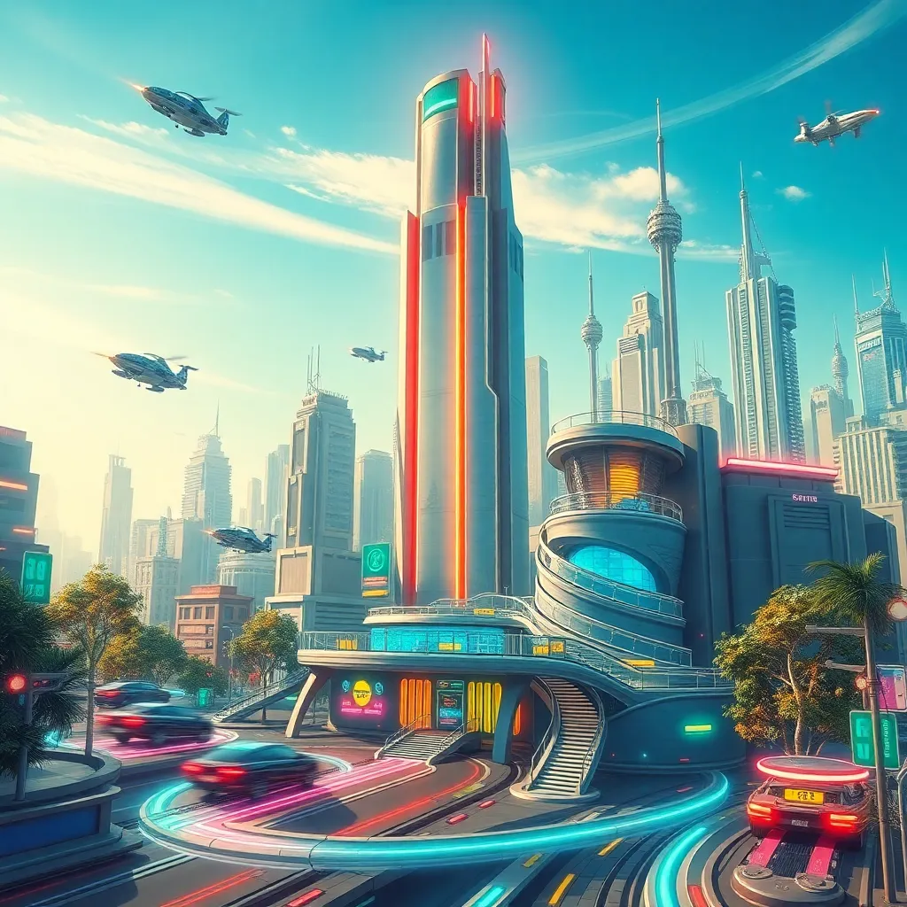 Create an imaginative futuristic cityscape with a neon-lit skyscraper in the center, surrounded by flying cars and hoverbikes. Incorporate a futuristic transportation hub with a spiral staircase and a holographic display. Add some neon-lit trees and a bright blue sky with a few wispy clouds. The city should have a vibrant, energetic atmosphere.
