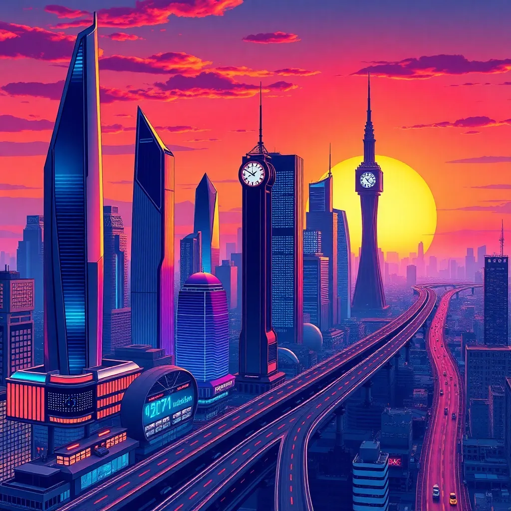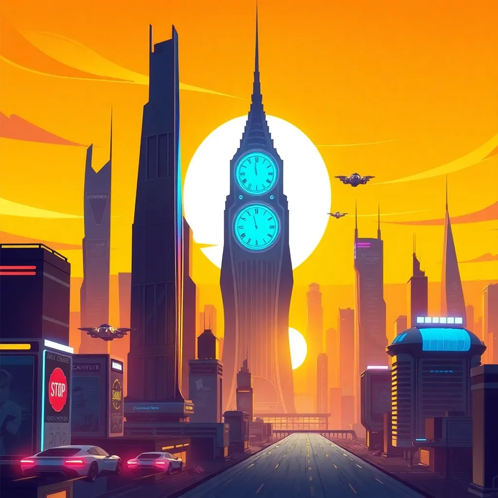 Create an illustration of a futuristic cityscape at sunset, with sleek skyscrapers, flying cars, and a vibrant atmosphere. Incorporate a prominent clock tower with a glowing blue face, surrounded by a halo of light. The sky should be a warm orange-yellow, with a few wispy clouds. Incorporate neon lights and a sense of energy.