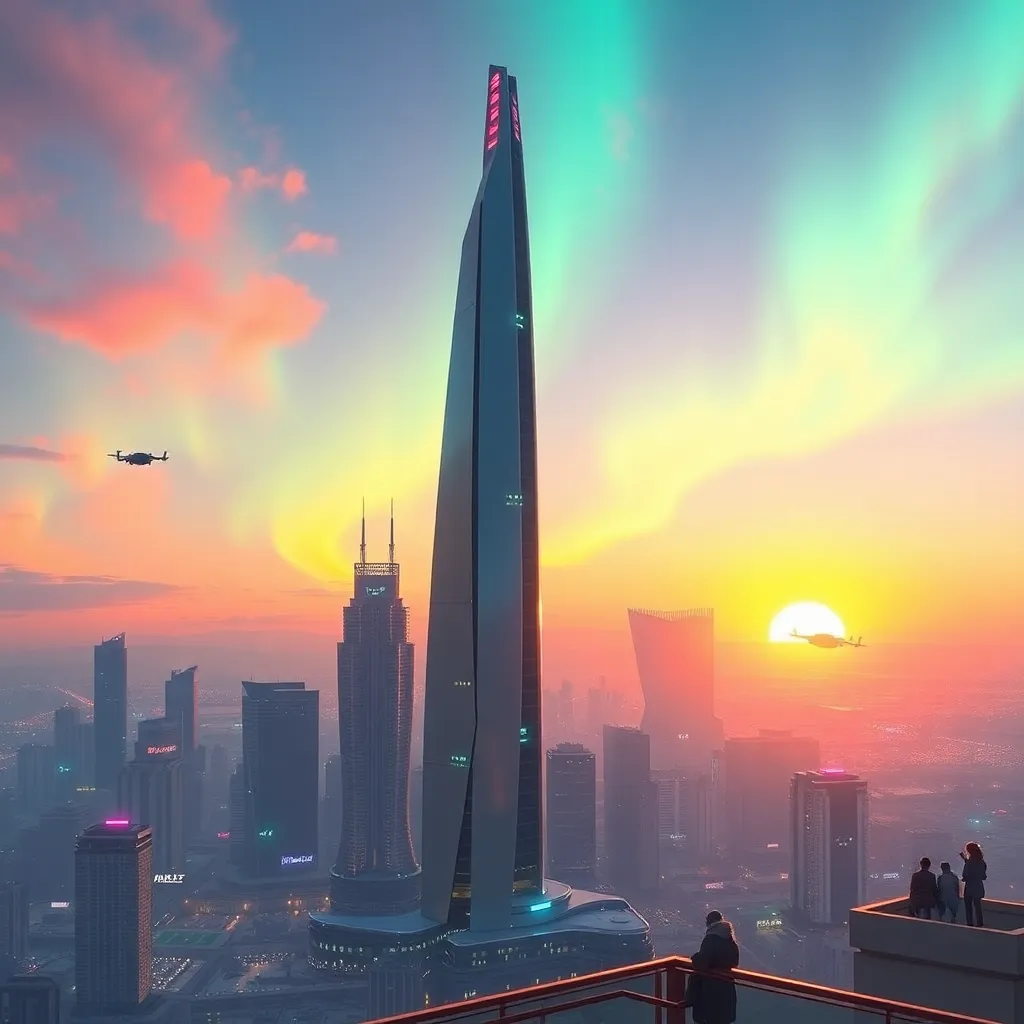 Create a futuristic cityscape at sunset with a sleek, silver skyscraper as the main attraction. Incorporate vibrant colors, neon lights, and a bustling atmosphere. Include a few flying vehicles and people enjoying the view from the rooftop. The city should be surrounded by a majestic, glowing aurora borealis.