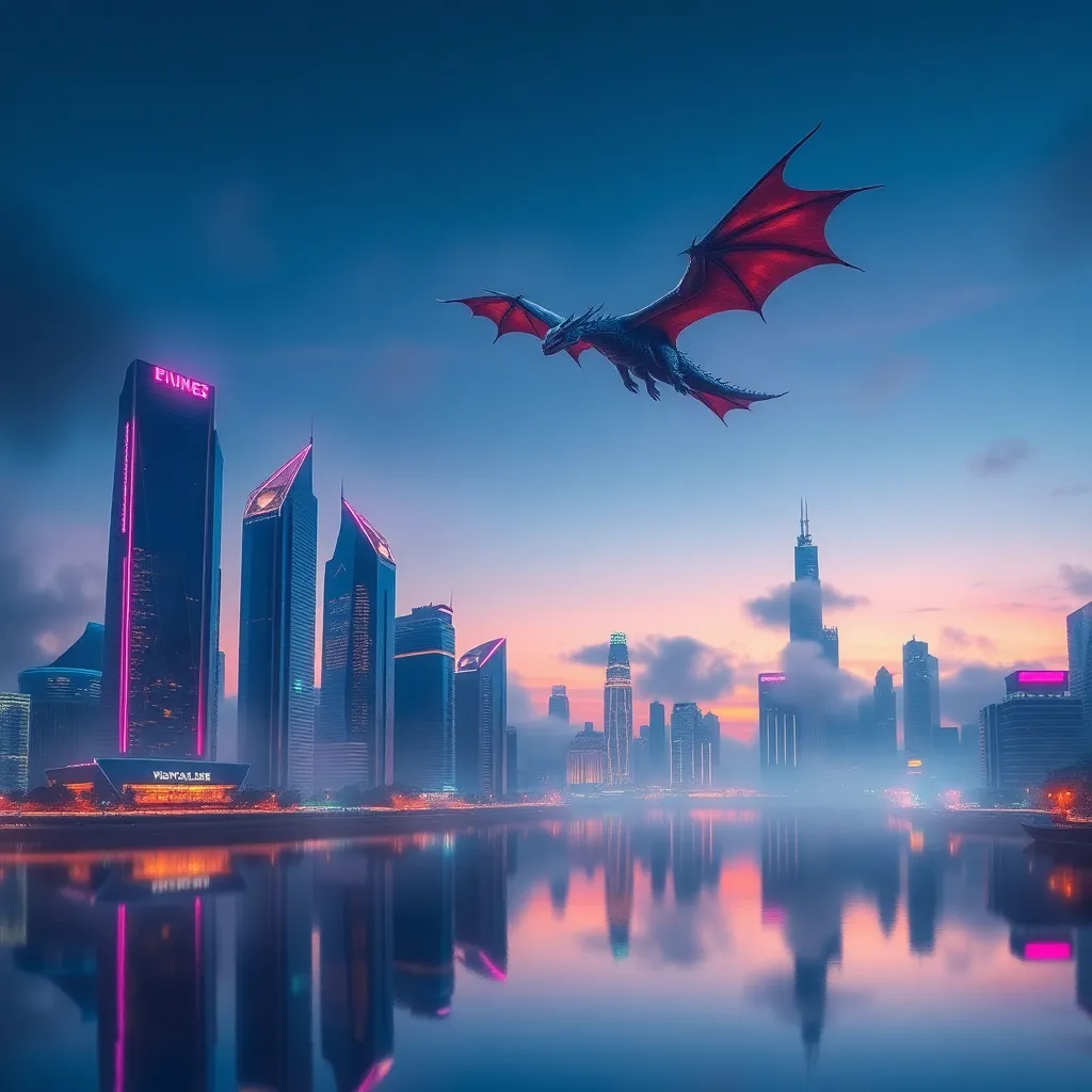 Imagine a futuristic cityscape at dusk, with sleek skyscrapers and neon lights reflecting off a serene lake. In the foreground, a group of friends are gathered around a holographic device, laughing and pointing at the stunning display. Capture the vibrant colors and whimsical atmosphere of this futuristic gathering spot.