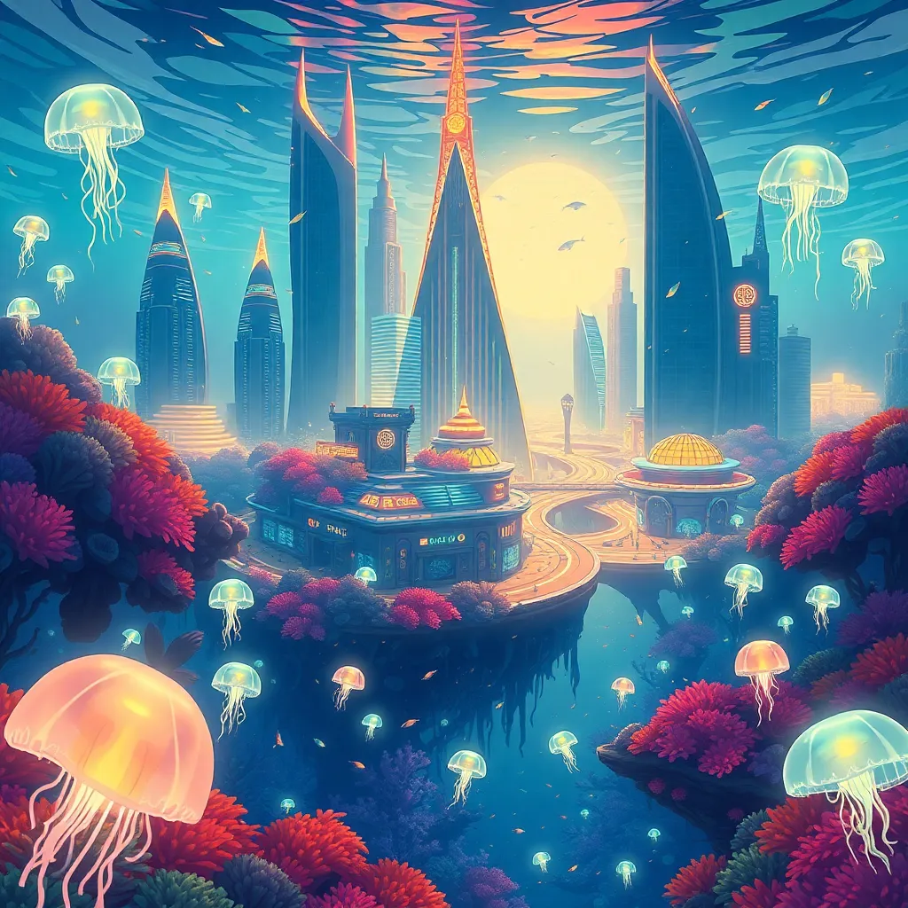 Create an illustration of a futuristic underwater city, with sleek skyscrapers and neon-lit streets. The city should be surrounded by a vibrant coral reef, teeming with marine life. Incorporate glowing jellyfish and schools of bioluminescent fish. The atmosphere should be dreamy and mystical, with a touch of nostalgia.