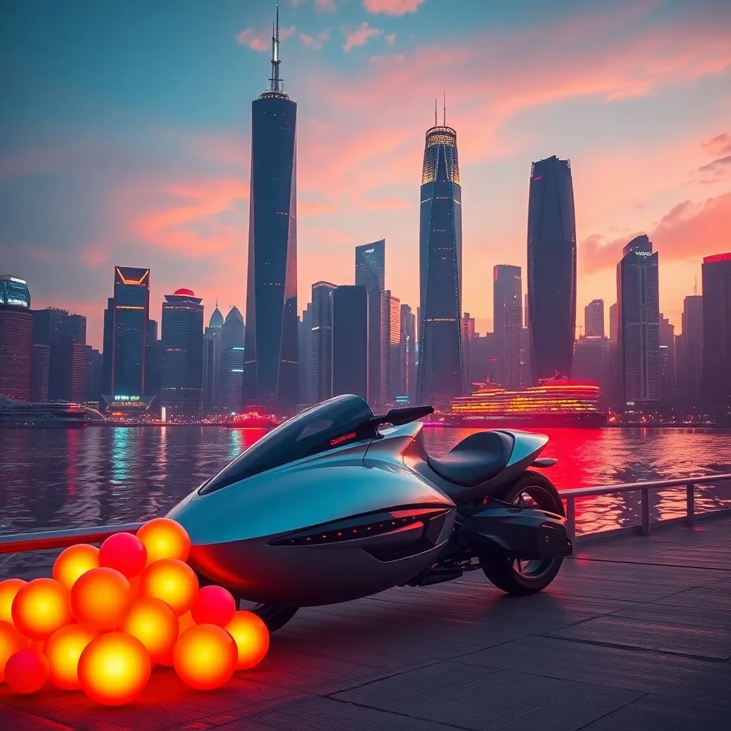 Imagine a futuristic cityscape at sunset, with towering skyscrapers and neon lights reflecting off the water. In the foreground, a sleek, silver hoverbike is parked on the dock, surrounded by a cluster of vibrant, glowing orbs that seem to be emitting a soft hum. Generate an image that captures this futuristic scene.