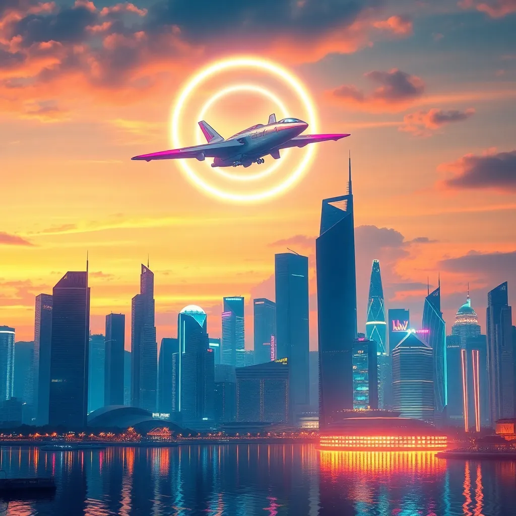 Imagine a futuristic cityscape at sunset, with sleek skyscrapers and neon lights reflecting off the water. A sleek, silver airship soars above, leaving a trail of glittering sparks. The city's residents, dressed in high-tech attire, gather at the waterfront to marvel at the aerial display. Generate an image that captures this vibrant scene.