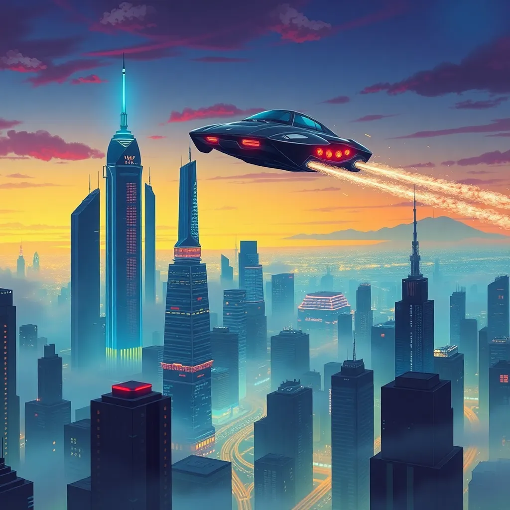 Create a futuristic cityscape at sunset, with sleek skyscrapers and neon lights reflecting off the wet pavement. Incorporate a flying car hovering above the city, with a subtle mist of fog rolling in. The color palette should be a mix of warm oranges, blues, and purples, with a sense of depth and dimensionality.
