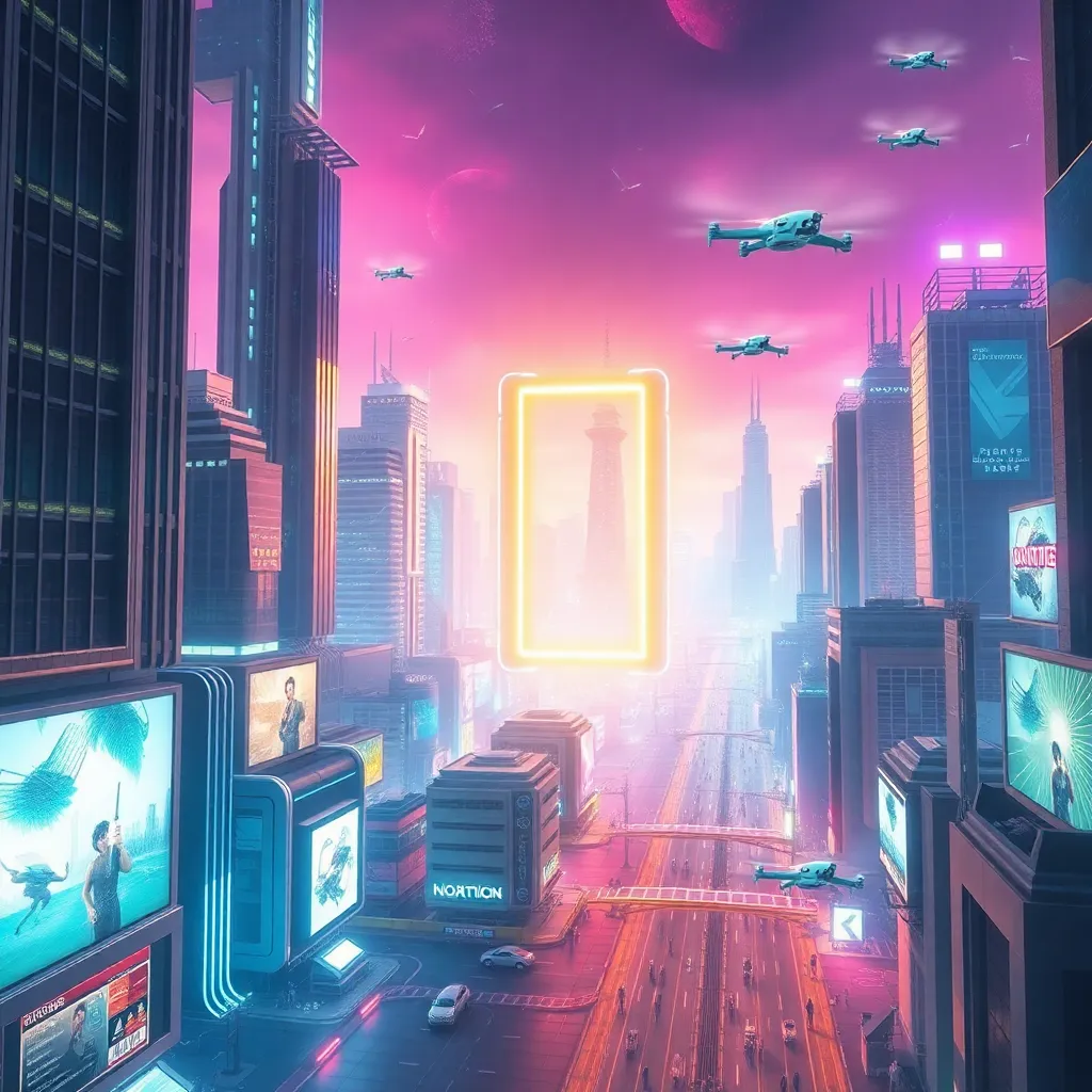Imagine a futuristic cityscape with towering skyscrapers and sleek, neon-lit streets. A massive, glowing portal has appeared in the center of the city, emitting a warm, pulsing light. The atmosphere is vibrant and energetic, with flying drones and holographic advertisements filling the air. Generate an image that captures this futuristic scene.