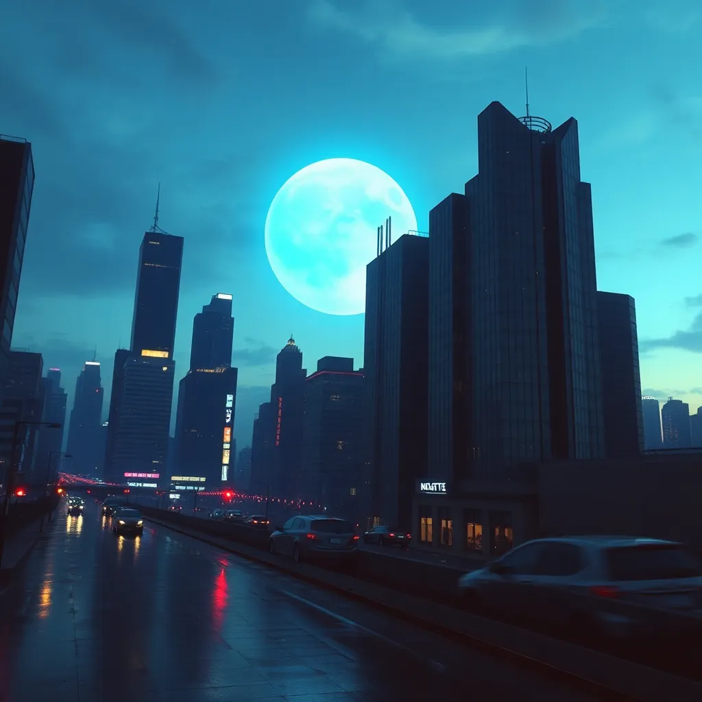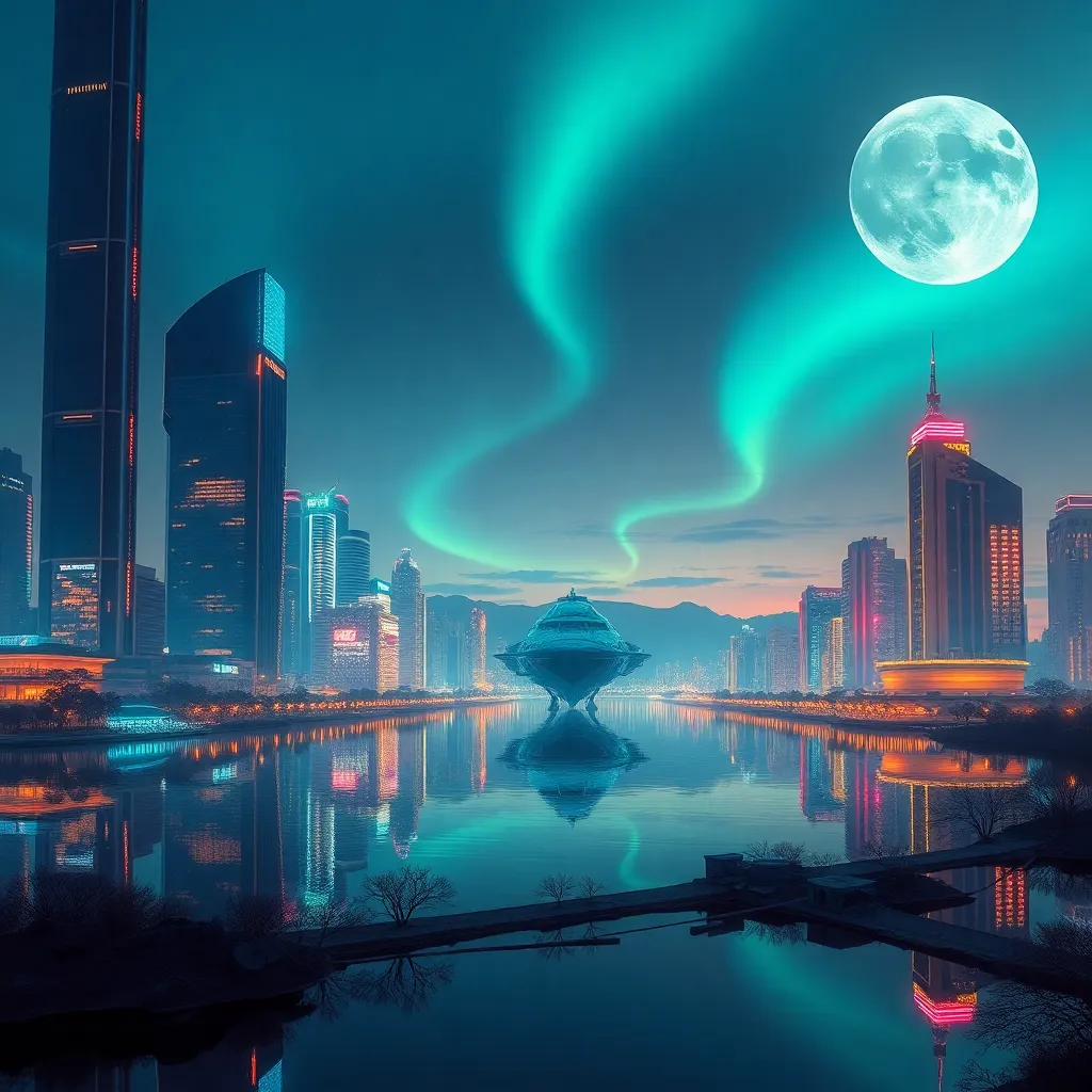 Create a futuristic cityscape at dusk, with sleek skyscrapers and neon lights reflecting off a calm, moonlit lake. Incorporate a majestic spaceship docked in the distance, with a subtle aurora borealis effect in the sky. Use vibrant colors and intricate details to bring this mesmerizing scene to life.