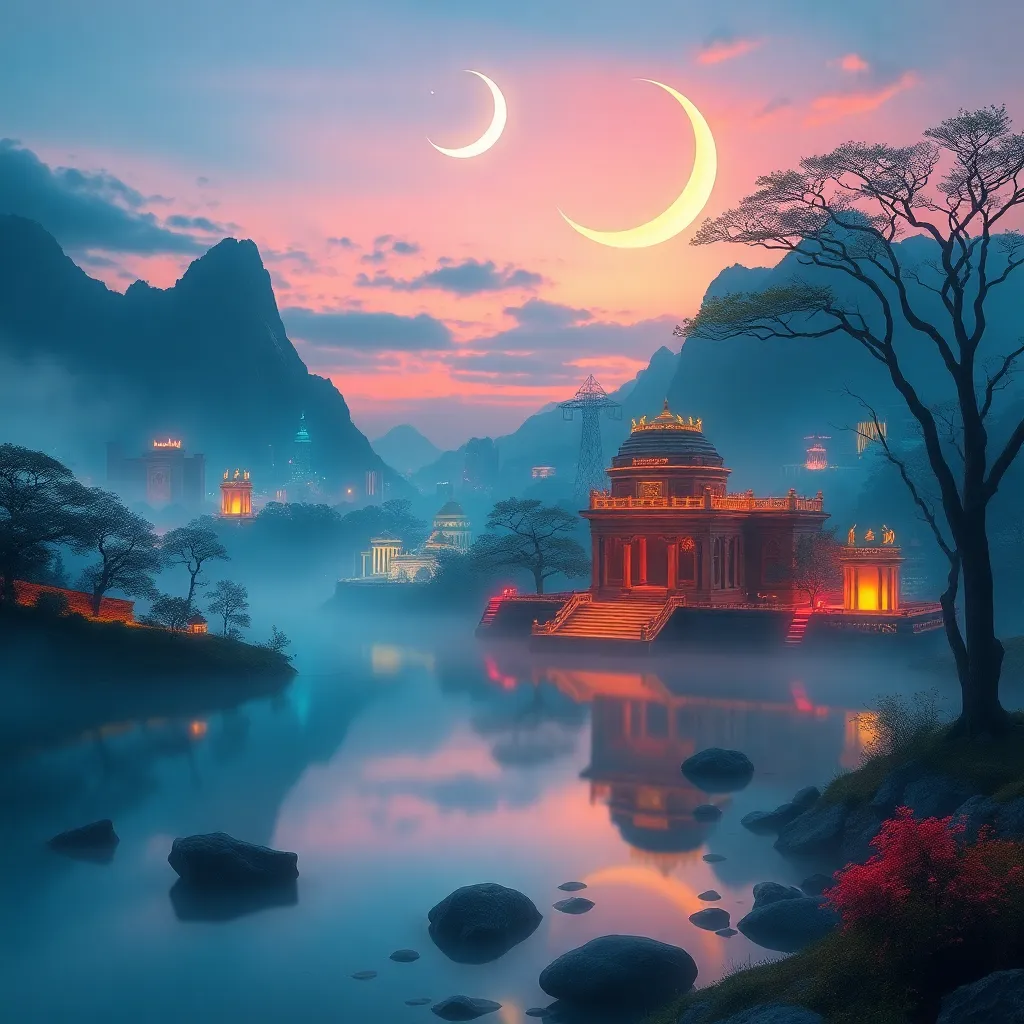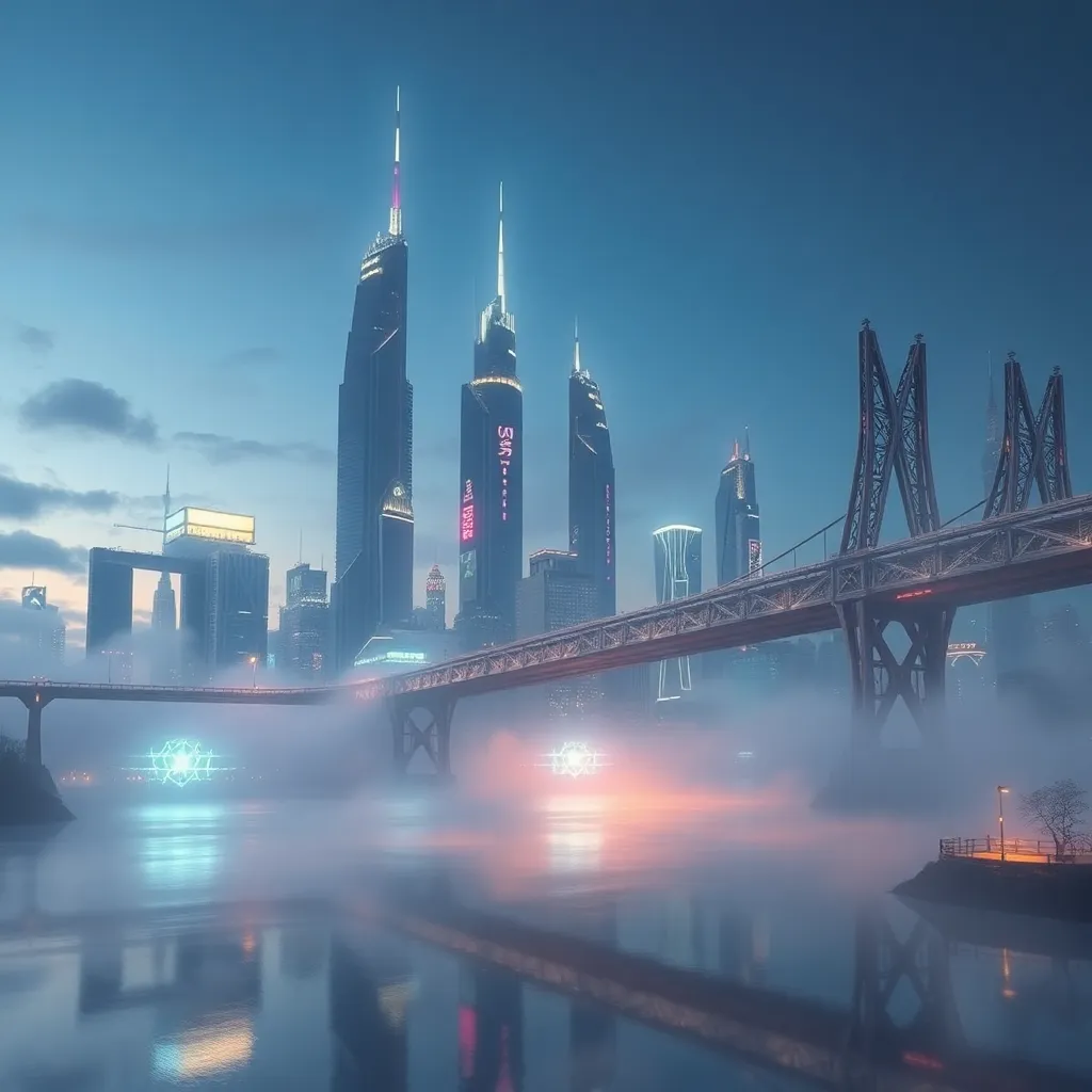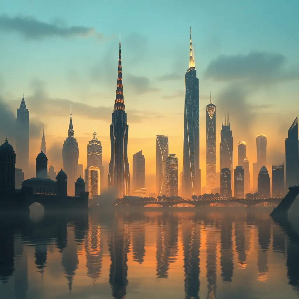 Create an ethereal cityscape at dusk, with towering spires and gleaming skyscrapers reflected in a serene lake. Incorporate soft, warm lighting and subtle mist effects to evoke a sense of mystery and tranquility. The city should appear both futuristic and ancient, with intricate details and textures.