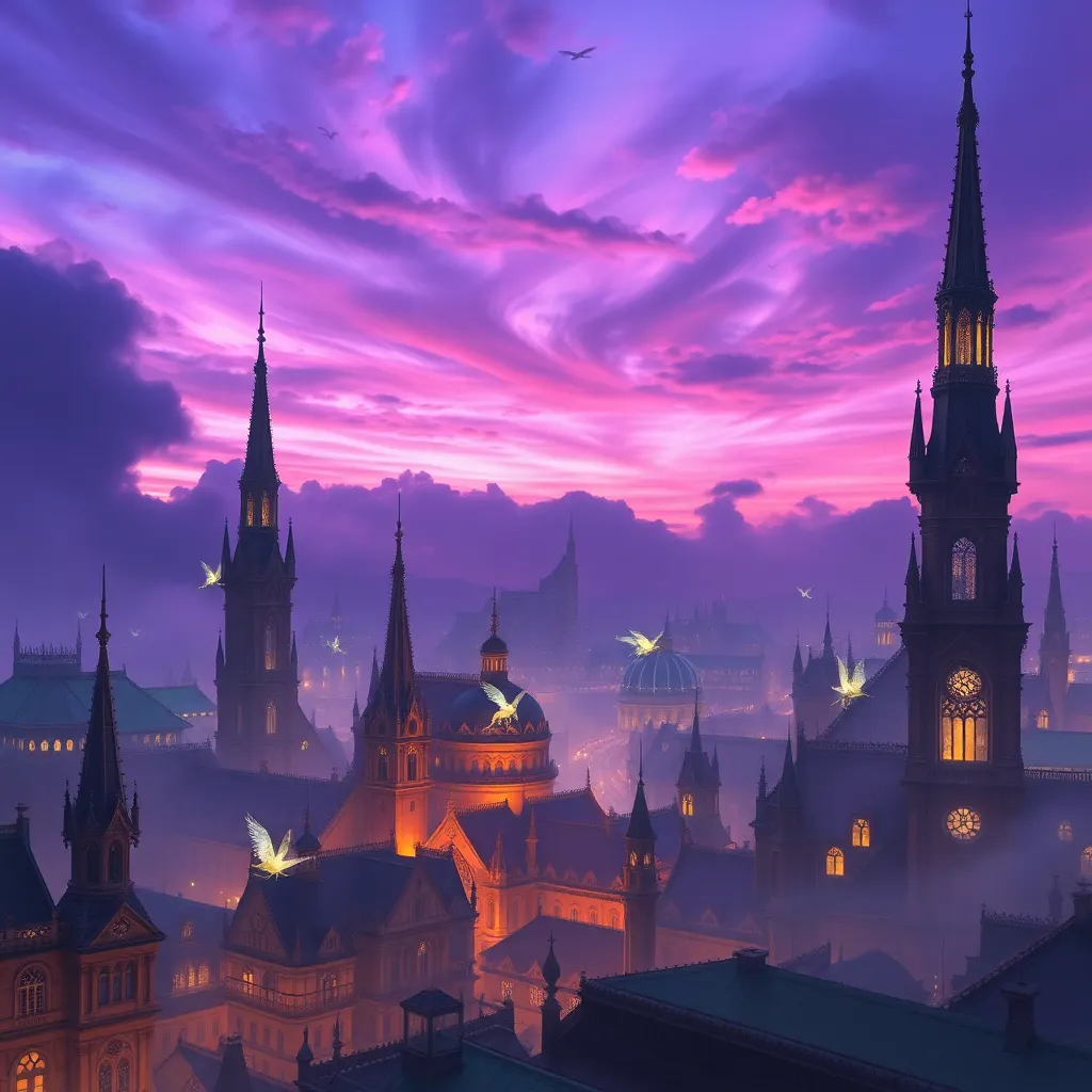 Create an otherworldly cityscape at dusk, with towering spires and iridescent architecture blending seamlessly into the swirling purple clouds. Incorporate glowing, ethereal creatures flitting about the rooftops, as the city's ancient magic begins to stir, casting a warm, golden light across the mystical landscape.