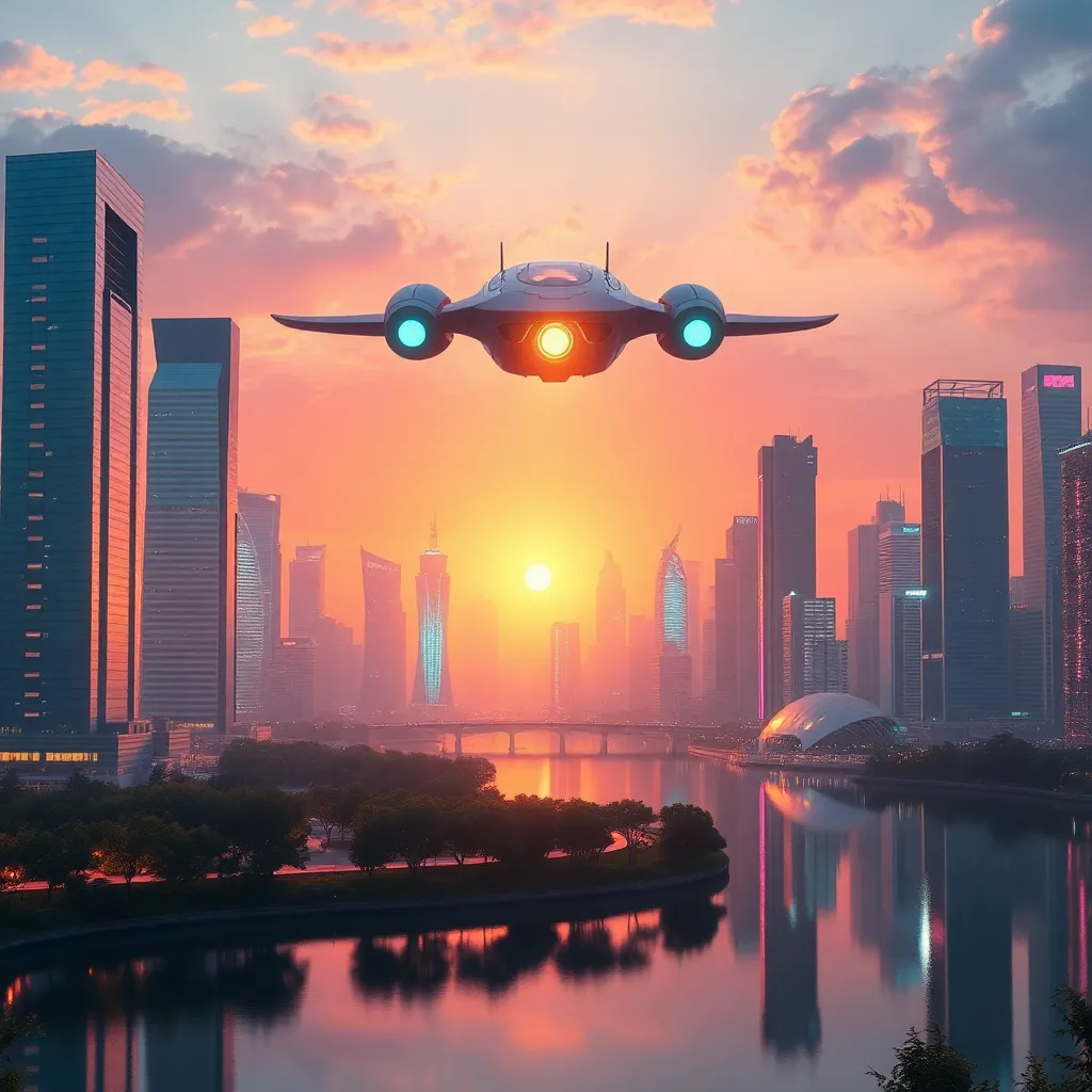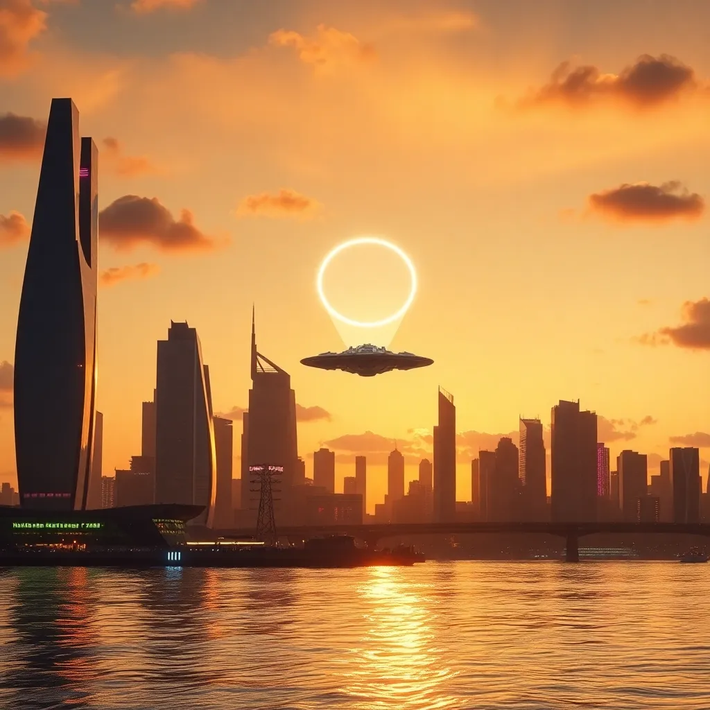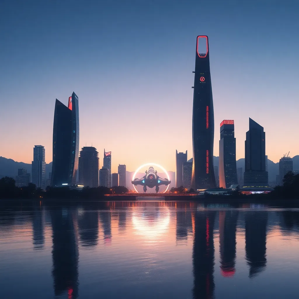 Imagine a futuristic cityscape at dusk, with sleek skyscrapers and neon lights reflecting off a tranquil lake. A sleek, silver spacecraft lands softly on the water's edge, emitting a gentle hum. The surrounding city is a blend of ancient and modern architecture, with lush greenery and vibrant street art.
