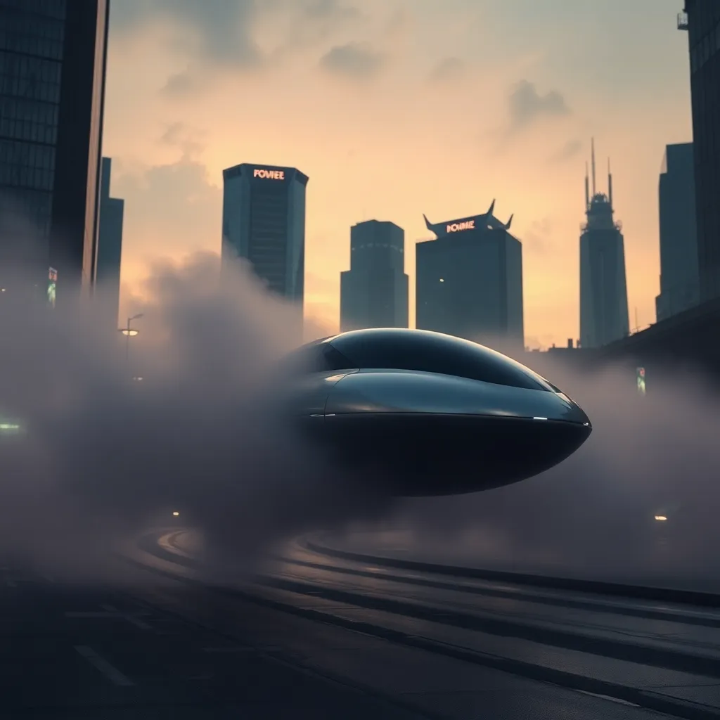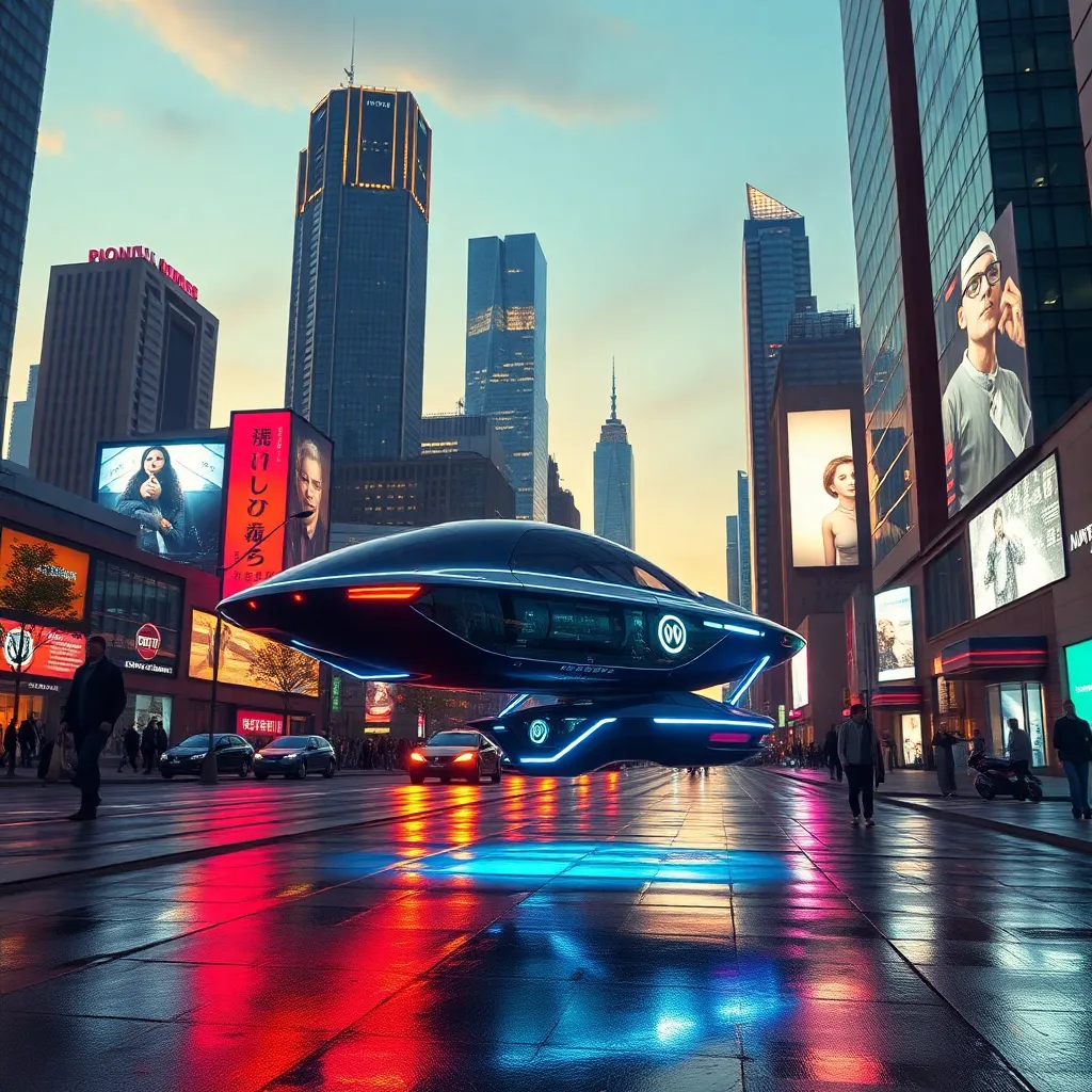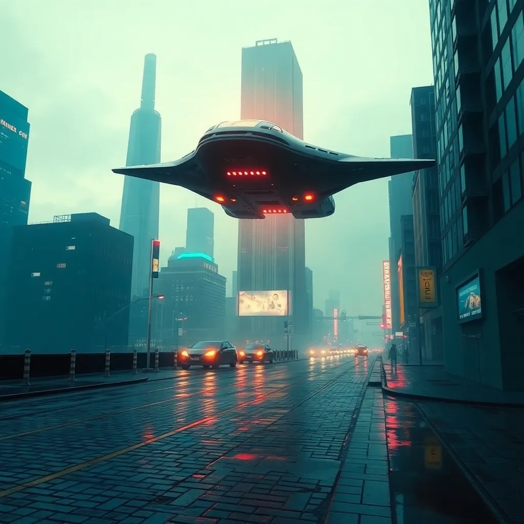 Imagine a futuristic cityscape at dusk, with sleek skyscrapers and neon lights reflecting off a tranquil lake. A sleek, silver spacecraft lands softly on the water's edge, emitting a gentle hum. The surrounding city is a blend of ancient and modern architecture, with lush greenery and vibrant street art.
