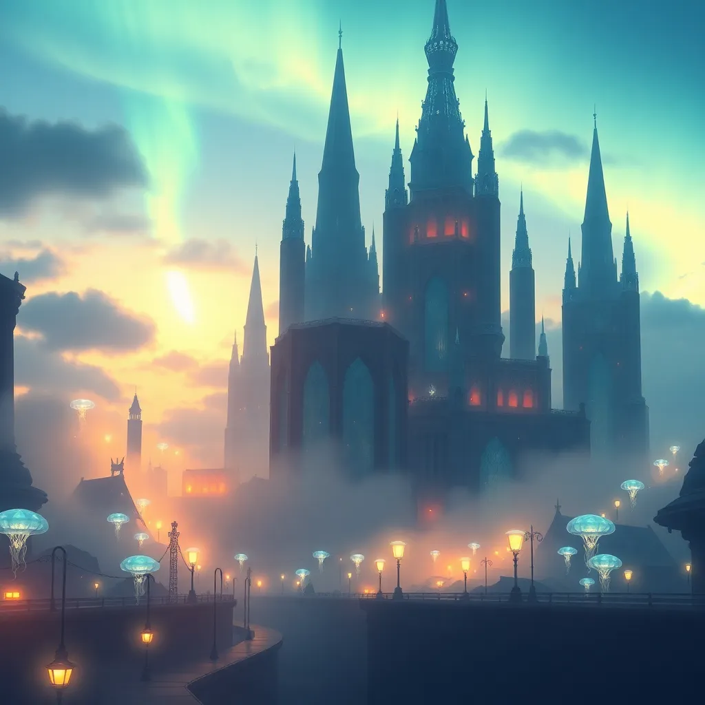 Create an ethereal cityscape at dusk, with towering crystal spires and wispy fog rolling in. Incorporate iridescent jellyfish-like streetlights, glowing pathways, and a distant, shimmering aurora borealis. The city should exude an otherworldly, mystical ambiance, as if it's a gateway to a parallel dimension.