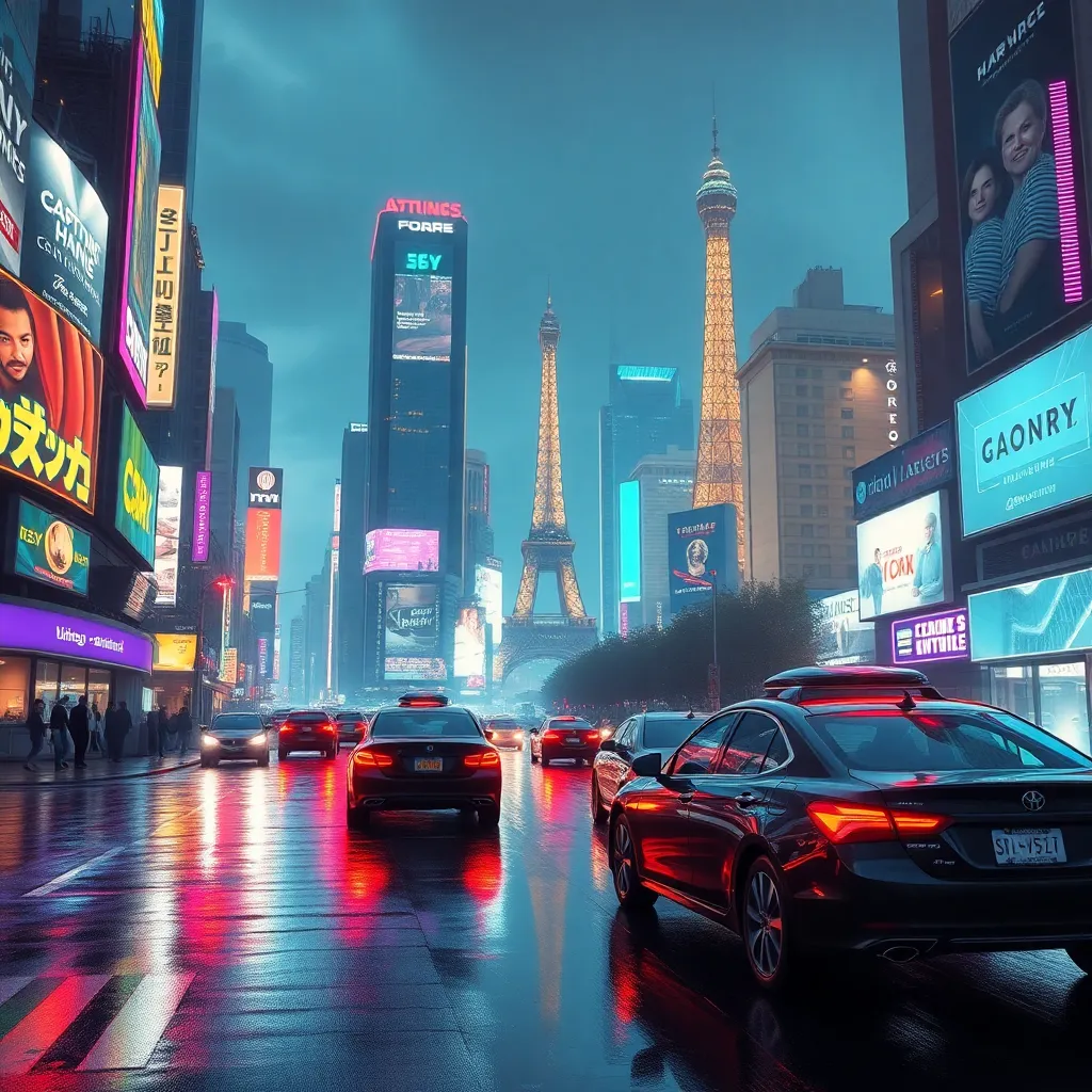 Create a futuristic cityscape with neon-lit skyscrapers, holographic advertisements, and flying cars zipping by. Incorporate a subtle glow of city lights reflecting off the wet pavement. The atmosphere should be vibrant and dynamic, with a hint of nostalgia for a bygone era. Incorporate a iconic landmark like the Eiffel Tower.
