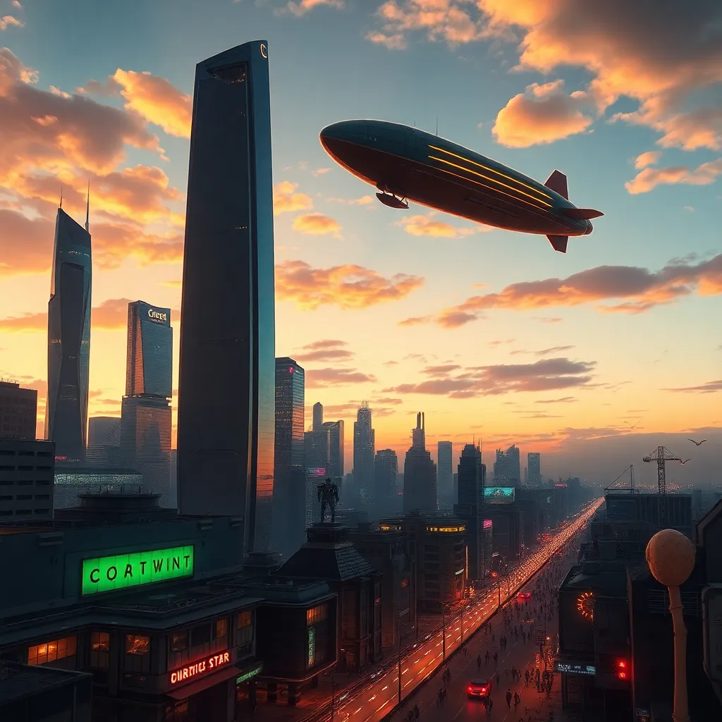 Create a futuristic cityscape at sunset, with sleek skyscrapers and neon lights reflecting off the water. Incorporate a hovering airship with a vintage flair, surrounded by wispy clouds and a warm, golden glow. The city's bustling streets are filled with robots, humans, and strange, glowing creatures.