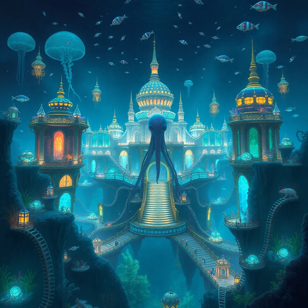 Create a futuristic underwater city, 'Aquaria', with a majestic palace made of coral and jellyfish-inspired architecture. The city should be bustling with aquatic life, with schools of bioluminescent fish swimming through the streets. Incorporate a giant squid statue as a central landmark, surrounded by glowing seaweed and kelp forests.