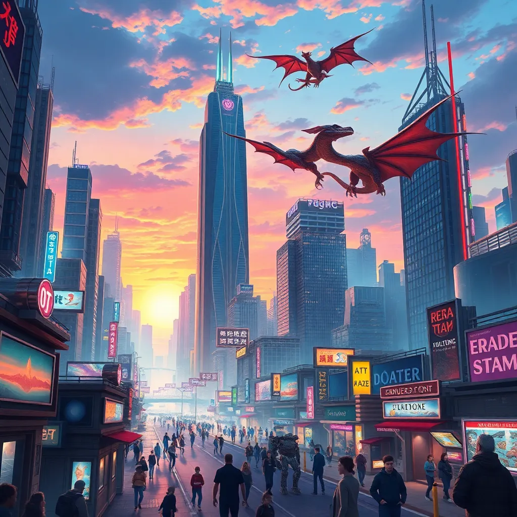 Create a futuristic cityscape at sunset with towering skyscrapers, neon lights, and a majestic flying dragon soaring above. Incorporate a bustling street scene with humans and robots coexisting, with a focus on vibrant colors and intricate details. The atmosphere should be dynamic and energetic, capturing the essence of a thriving metropolis.
