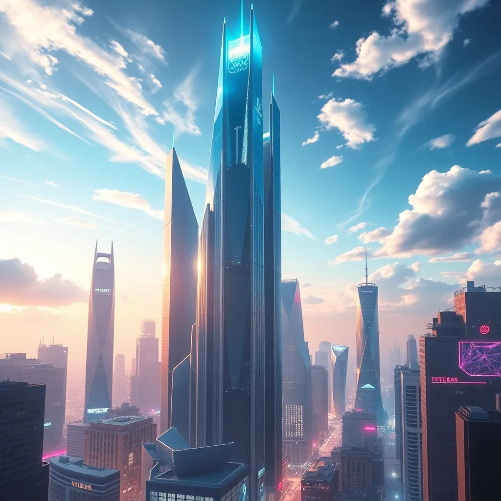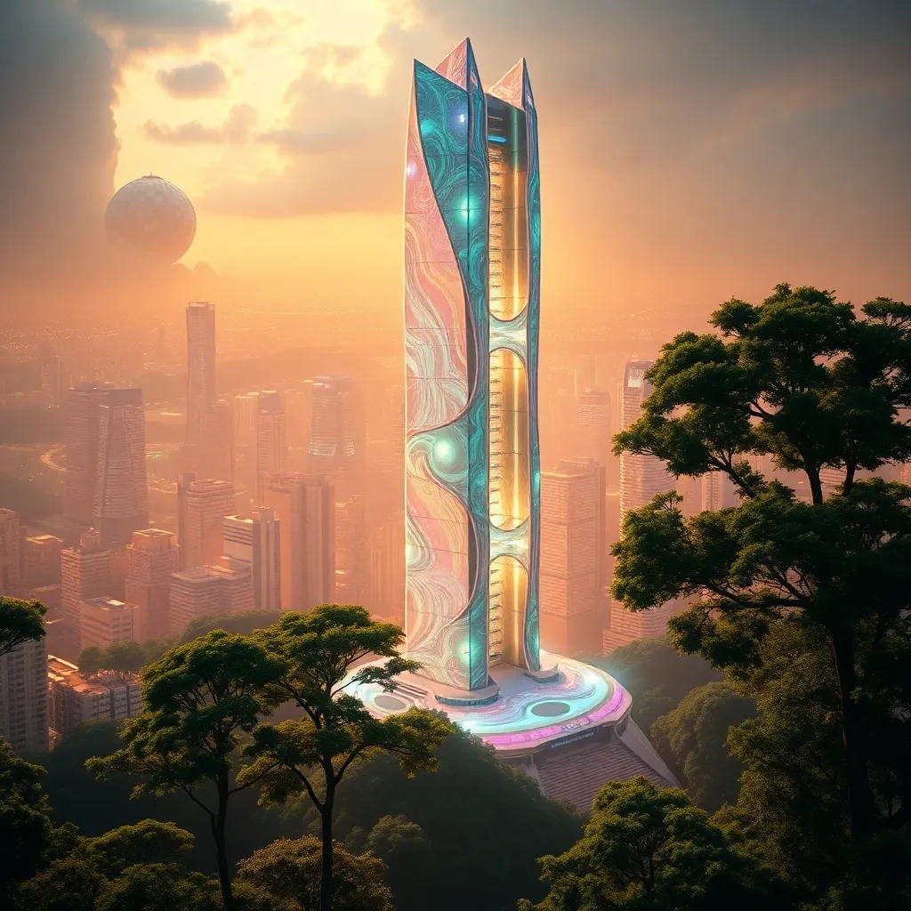 Imagine a futuristic cityscape with a glowing, iridescent skyscraper at its center. The building's surface is covered in swirling patterns that shift and change color as the viewer moves around it. The city is bathed in a warm, golden light, with towering trees and lush greenery surrounding the structure.
