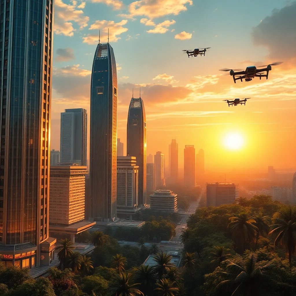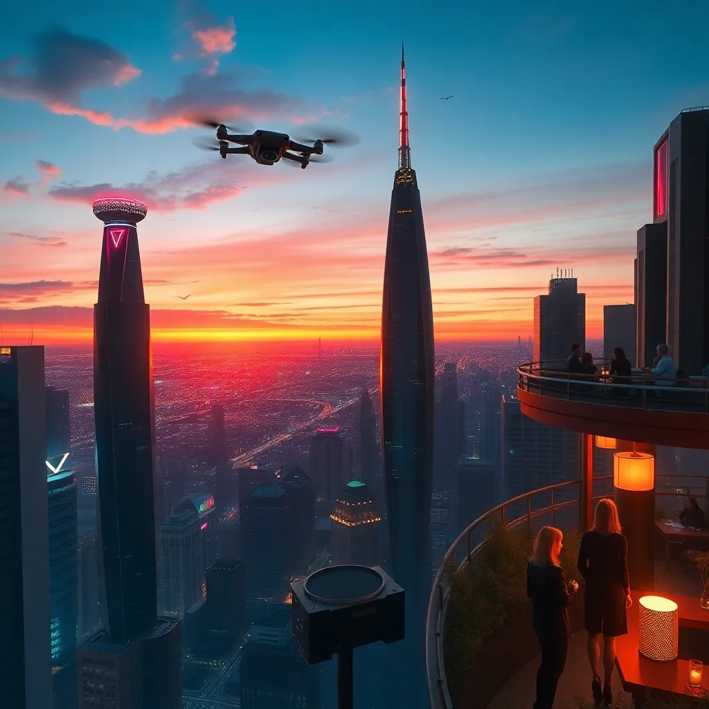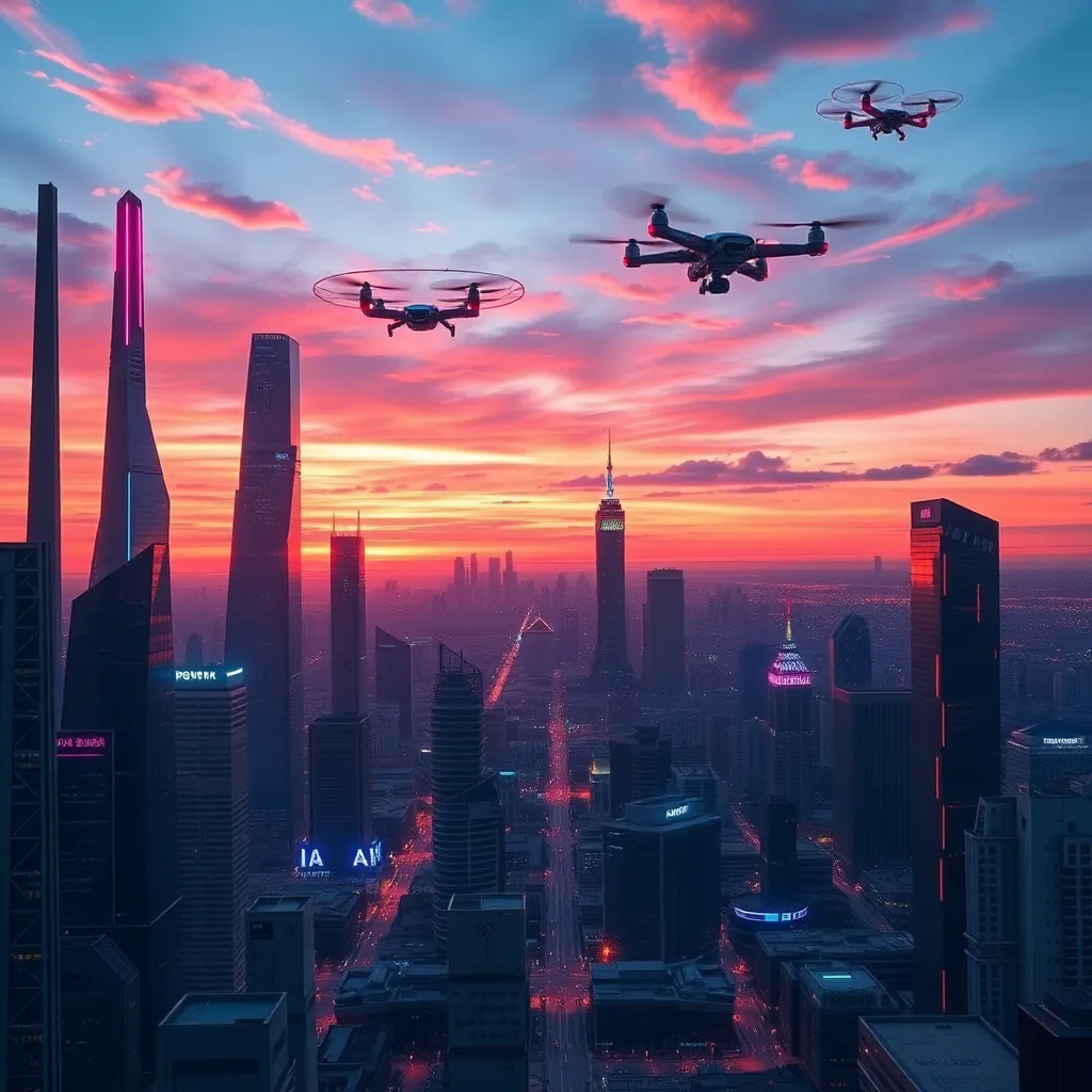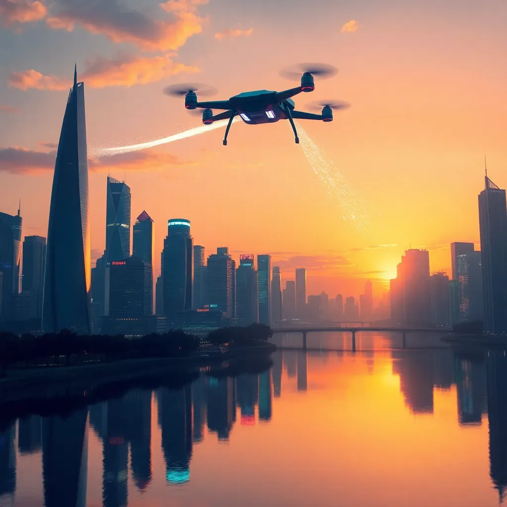 Envision a futuristic cityscape at sunset, with sleek skyscrapers and neon lights reflected in a serene lake. Incorporate a majestic flying drone soaring above, leaving a trail of glittering sparks. The atmosphere should be vibrant, yet peaceful, with a hint of mystery and technological advancement.