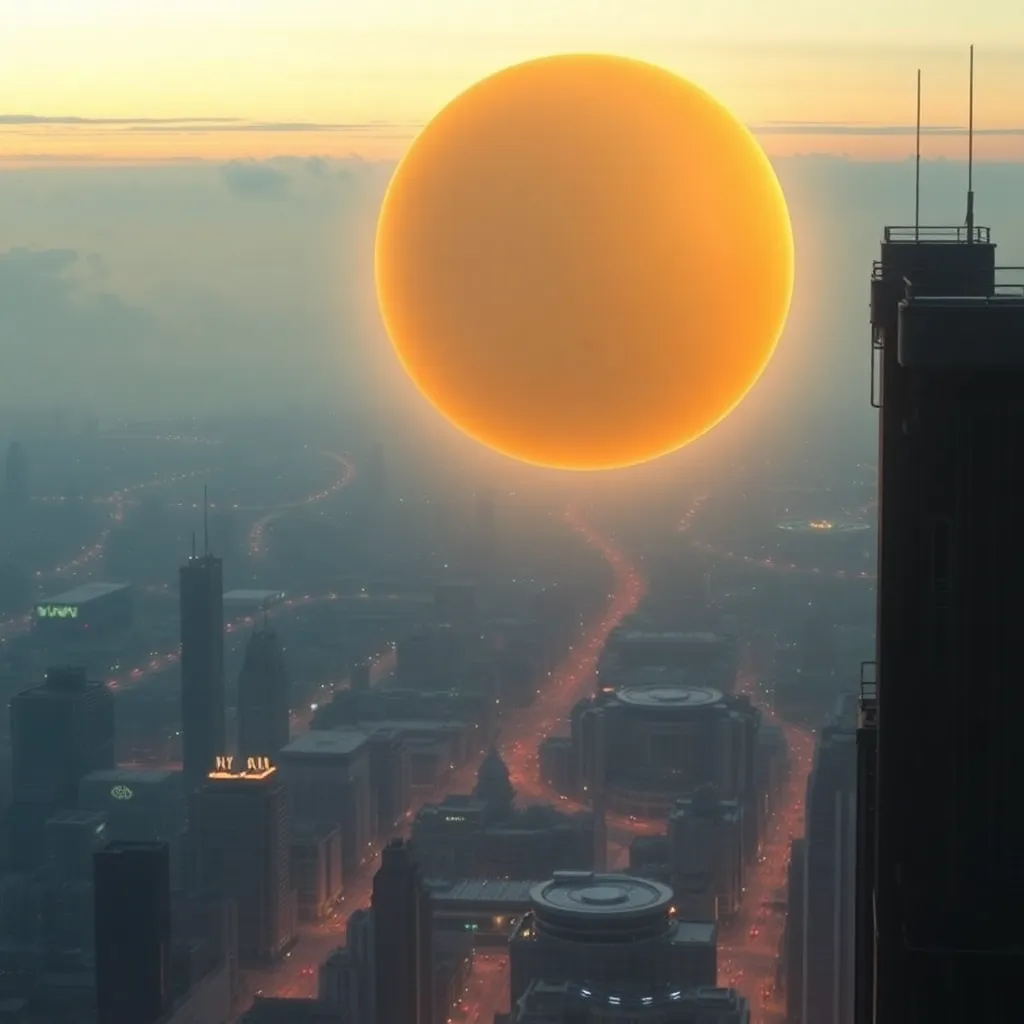 Create a futuristic cityscape at sunset with a sprawling metropolis in the distance, surrounded by towering skyscrapers and neon-lit streets. Incorporate a giant, glowing orb hovering above the city, emitting a warm, golden light that illuminates the surrounding landscape. Add subtle, wispy clouds and a hint of mist.