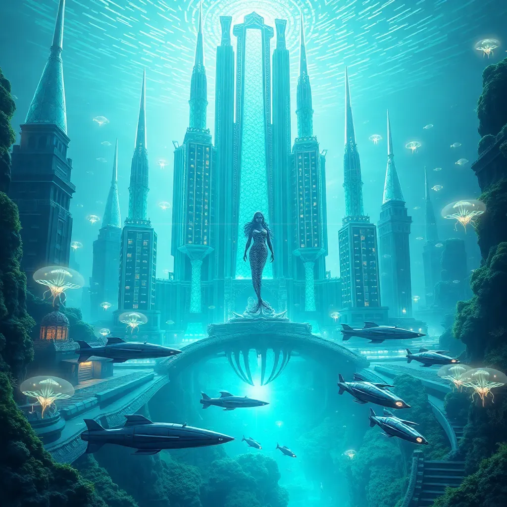 Create a futuristic underwater city, 'New Atlantis', with towering crystal spires, glowing jellyfish streets, and schools of neon fish swimming through the transparent skyscrapers. Incorporate a majestic mermaid statue at the city's heart, surrounded by a lush kelp forest and a fleet of sleek, bioluminescent submarines.