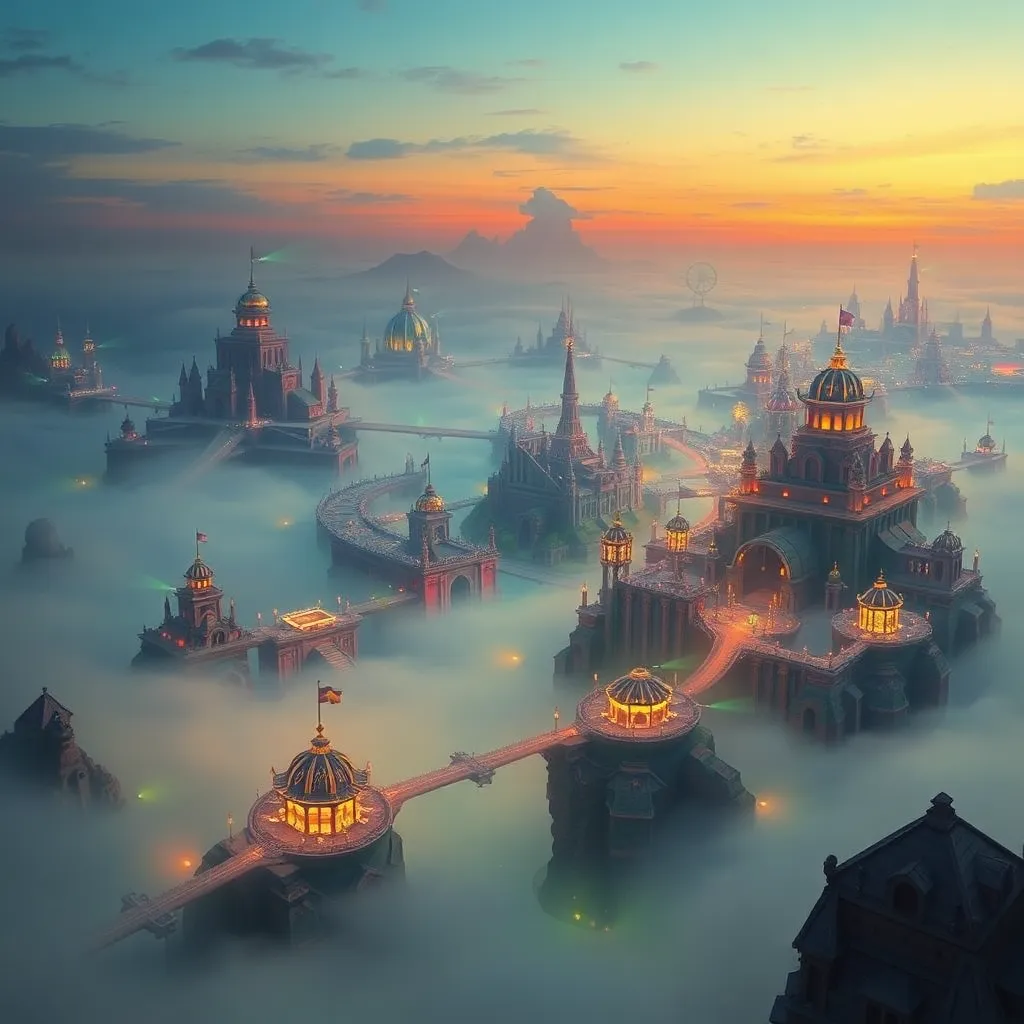 Create an ethereal cityscape at dusk, with a sprawling metropolis built on a series of interconnected islands surrounded by a swirling mist. Incorporate ancient ruins, glowing marketplaces, and majestic architecture. The atmosphere should be mystical and dreamlike, with a focus on vibrant colors and intricate details.
