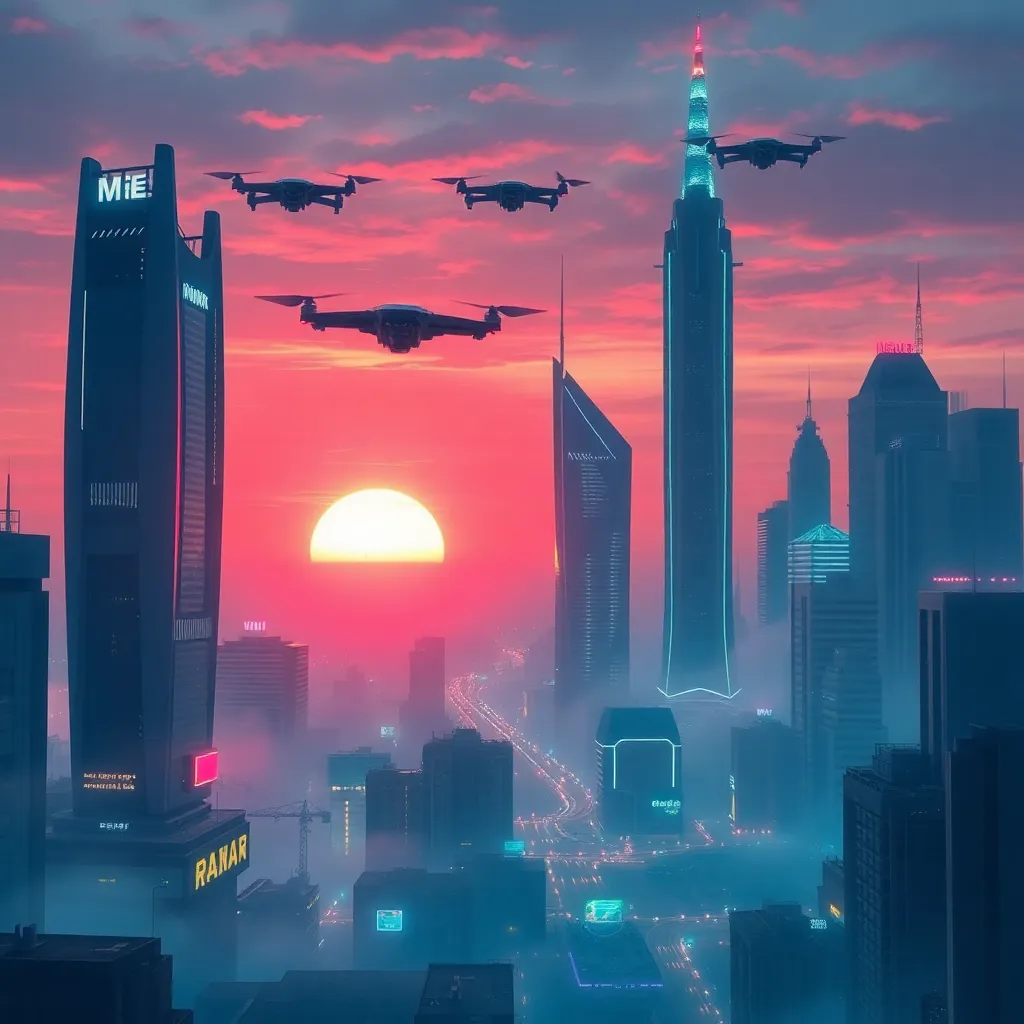 Create a futuristic cityscape at sunset, with sleek skyscrapers, glowing neon lights, and a misty atmosphere. Incorporate a giant robot standing tall in the center, surrounded by hovering drones and flying cars. The city's inhabitants are depicted as tiny silhouettes, going about their daily lives amidst the bustling metropolis.