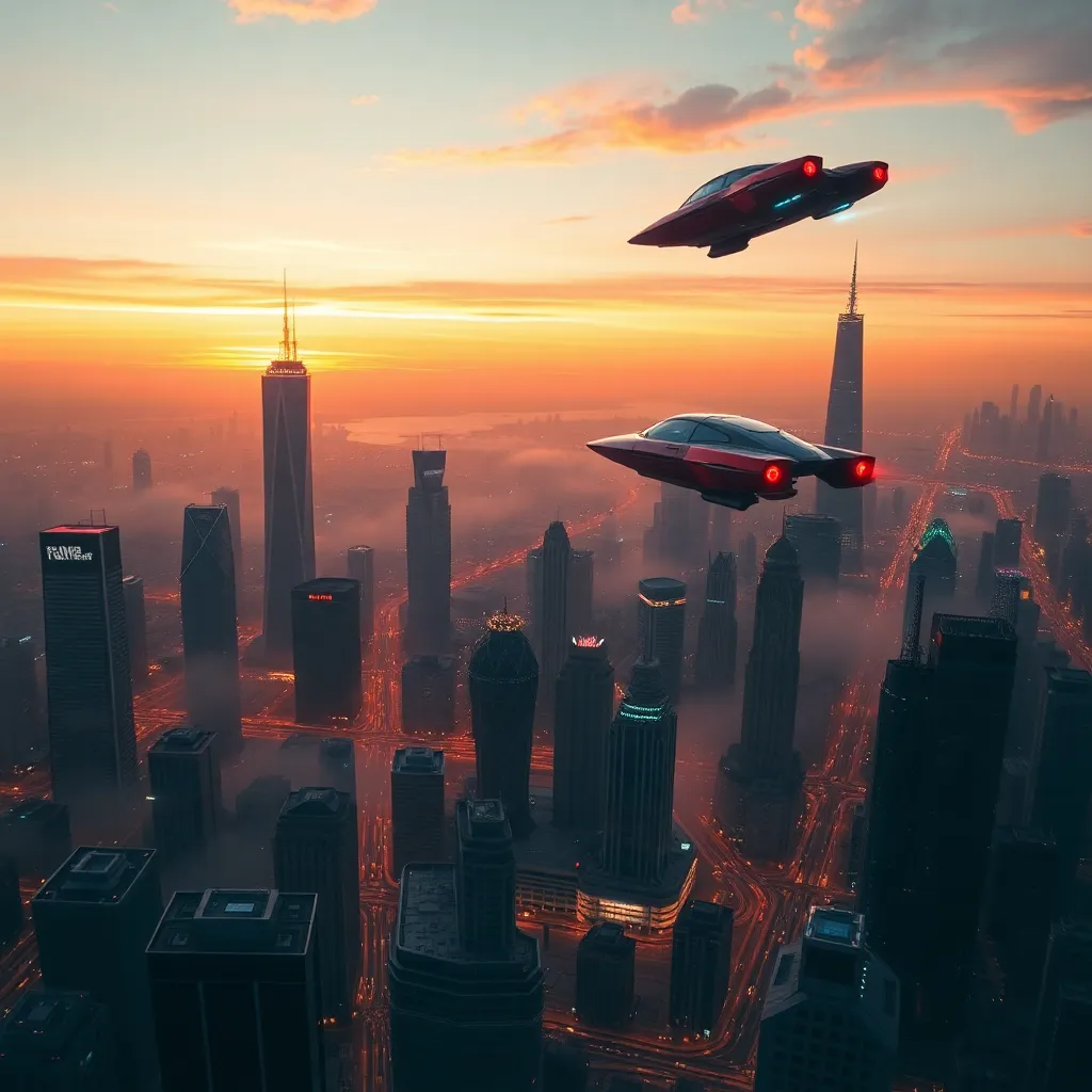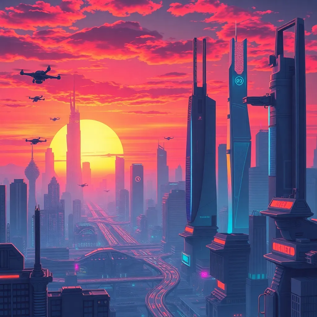 Create a futuristic cityscape at sunset, with sleek skyscrapers, neon lights, and a sprawling metropolis. Incorporate a sense of movement, with hovering cars and flying drones. Add a hint of retro-futurism, with vintage-style robots and cyberpunk elements. Use vibrant colors and bold lines to bring this world to life.