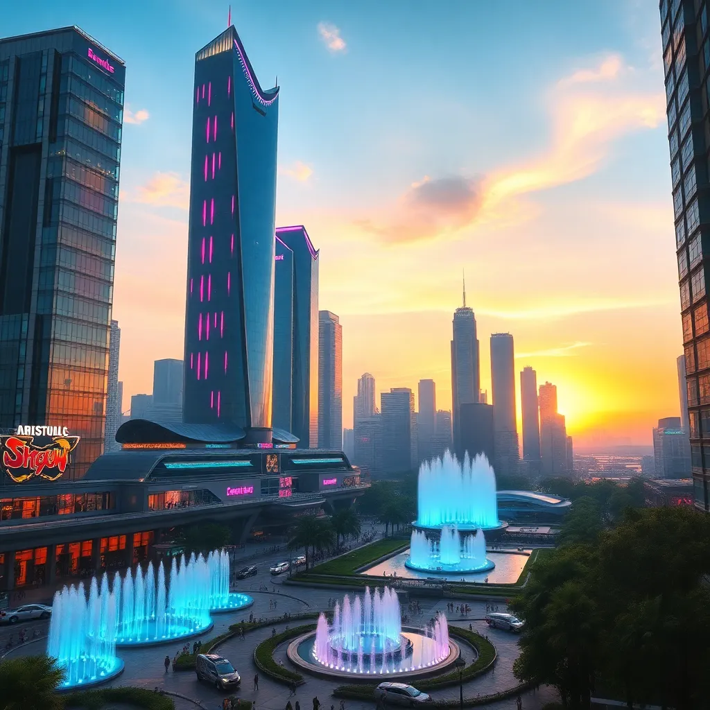 Envision a futuristic cityscape at sunset, with towering skyscrapers made of iridescent glass and neon lights that pulse in harmony with the rhythm of the city's underground music scene. Incorporate vibrant street art, hovercars, and a sprawling public park with a stunning fountain show. Create a mesmerizing urban dreamscape.