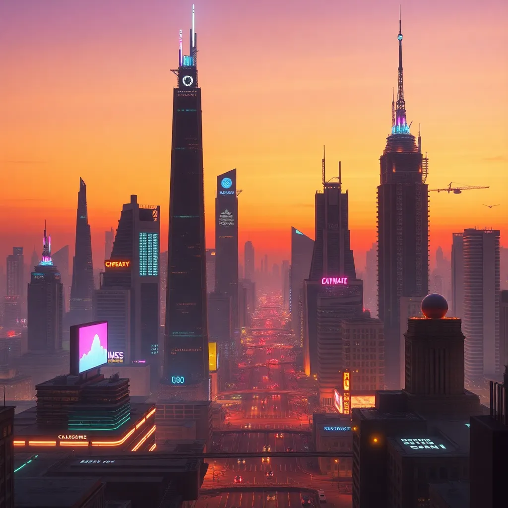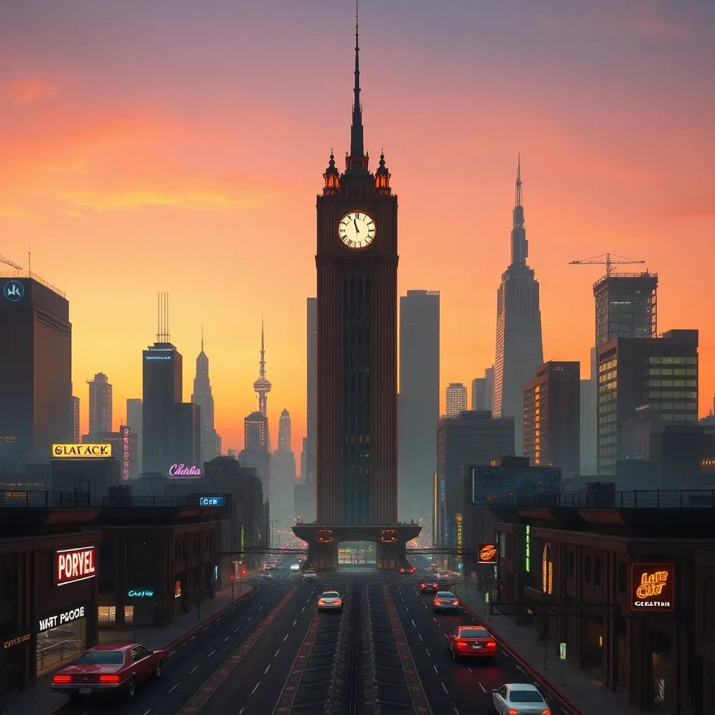 Create a futuristic cityscape at dusk, with towering skyscrapers and neon-lit streets. Incorporate a subtle sense of nostalgia, with vintage-style cars and a hint of retro-futurism. The sky should be a warm orange hue, with a subtle glow of city lights. Include a prominent clock tower in the center.