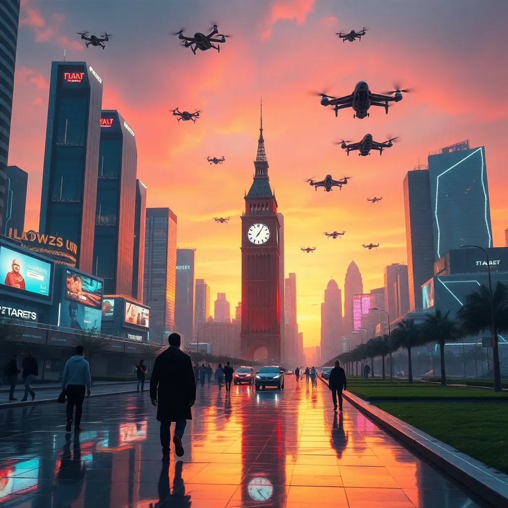 Envision a futuristic cityscape at dusk, with sleek skyscrapers and neon lights reflecting off the wet pavement. The air is filled with hovering drones and flying cars, while humans in futuristic attire walk alongside, enjoying the vibrant atmosphere. Incorporate a prominent clock tower and a sprawling city park.