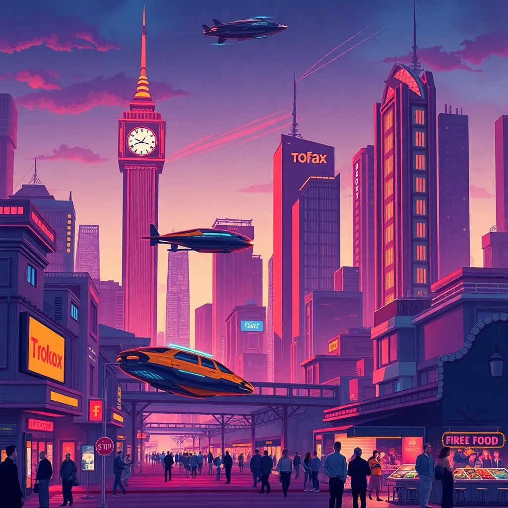 Create a futuristic cityscape at dusk, with towering skyscrapers and neon-lit streets. Incorporate a prominent clock tower, a hovercar flying by, and a group of people enjoying a street food festival. Use a vibrant color palette with warm oranges and purples to capture the city's energy and excitement.