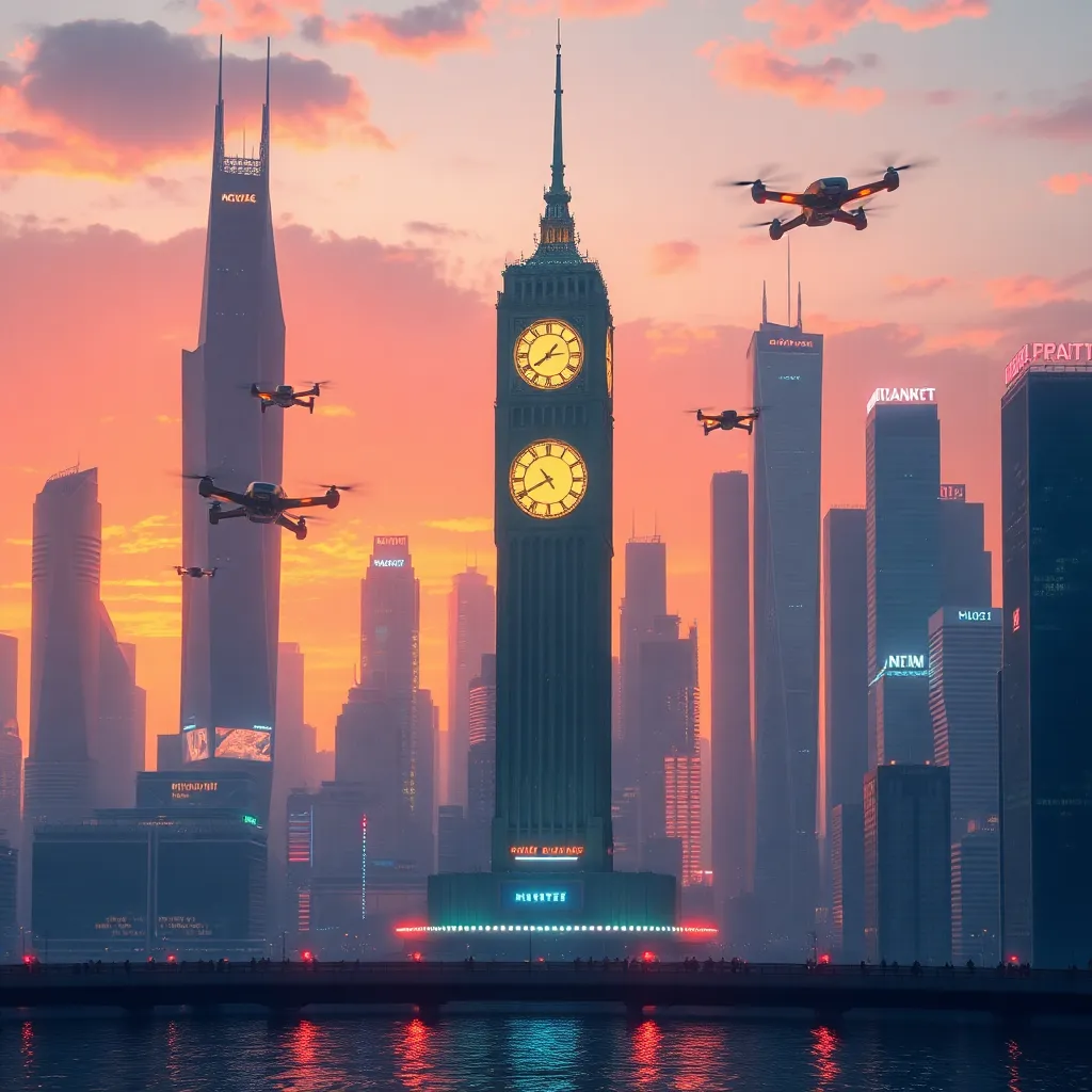 Design a futuristic cityscape at sunset, with towering skyscrapers and neon lights reflecting off the water. Incorporate a prominent clock tower with a glowing face, surrounded by flying cars and hovering drones. The atmosphere should be vibrant and energetic, with a hint of nostalgia and retro-futurism.