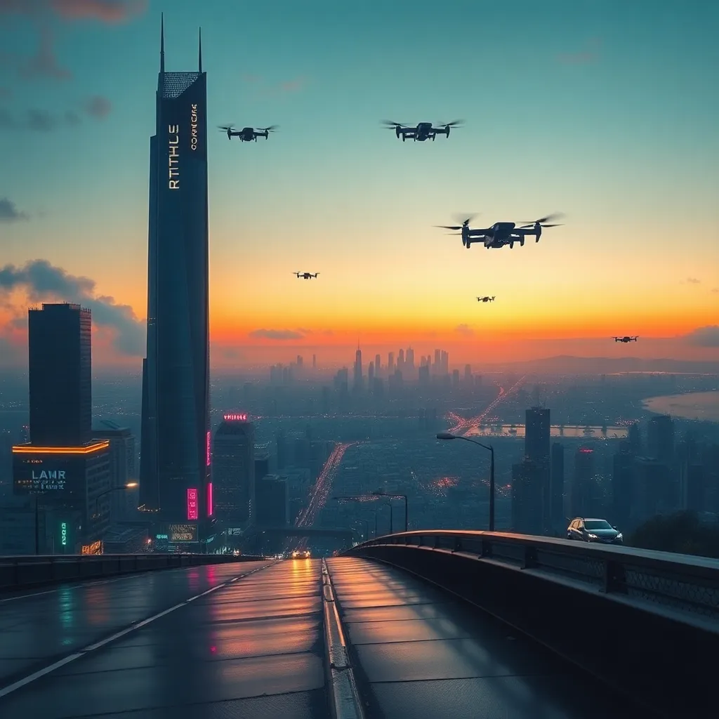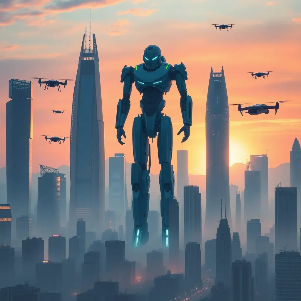 Imagine a futuristic cityscape with towering skyscrapers, neon-lit streets, and a massive robotic figure standing tall in the center. Incorporate vibrant colors, intricate details, and a sense of futuristic wonder. The city should be bustling with activity, with flying cars and drones zipping by. Make it visually stunning!