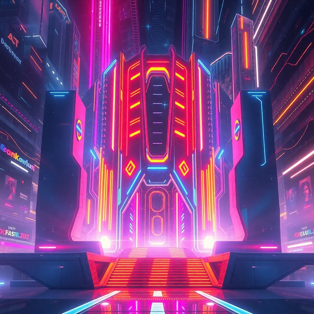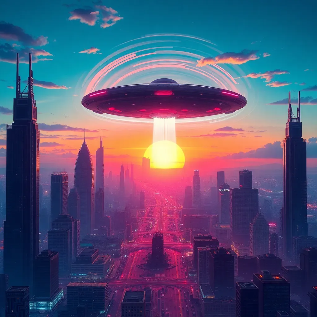 Create a futuristic cityscape at sunset with towering skyscrapers, neon-lit streets, and a sprawling metropolis. Incorporate a majestic spaceship landing in the distance, with a swirling vortex of colors and energy surrounding it. Use a vibrant color palette with bold contrasts, and add subtle details like wispy clouds and city lights.