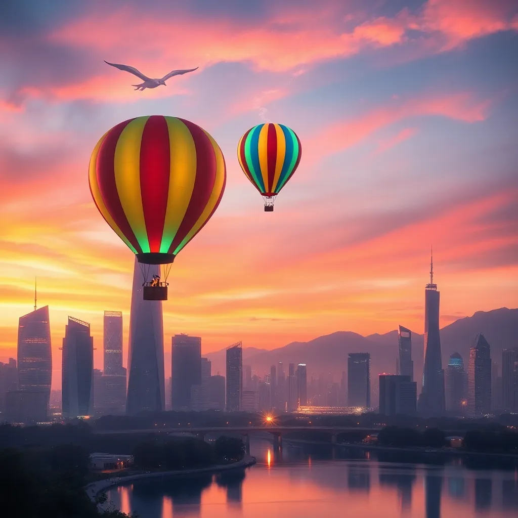 Envision a futuristic cityscape at sunset, with sleek skyscrapers and neon lights reflecting off a serene lake. Incorporate a vintage-style hot air balloon floating above the city, its colorful stripes glowing in the fading light. Add a sprinkle of magic dust and a wispy cloud formation resembling a dragon.