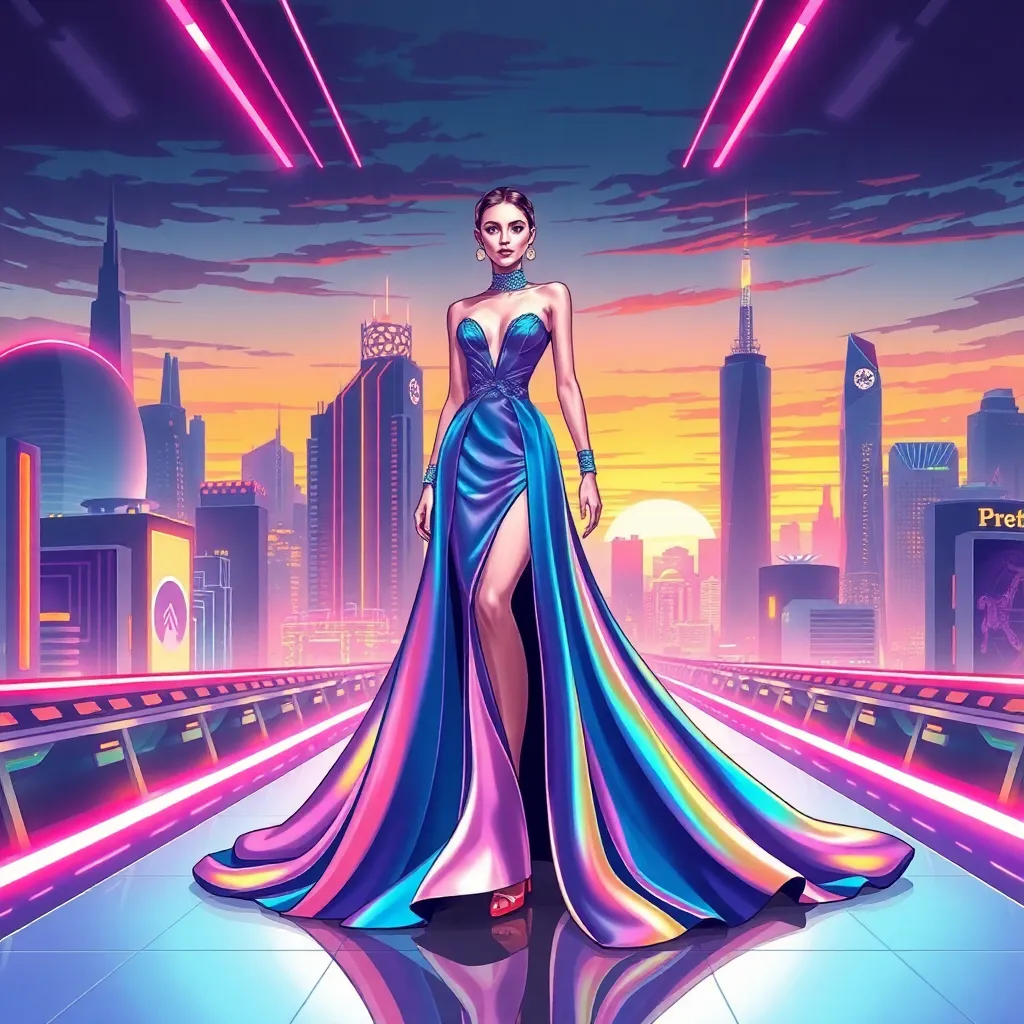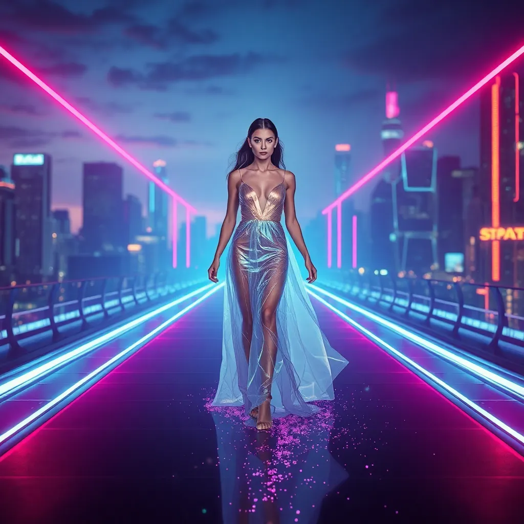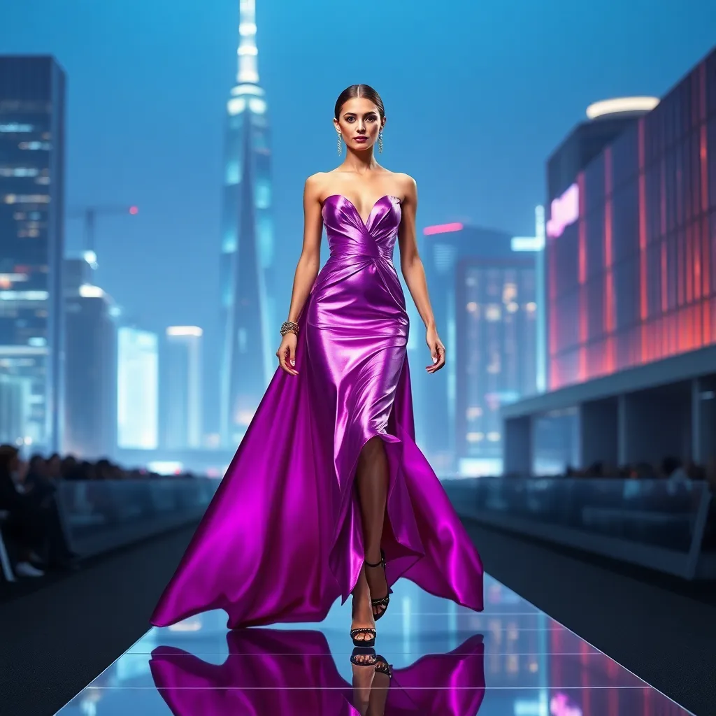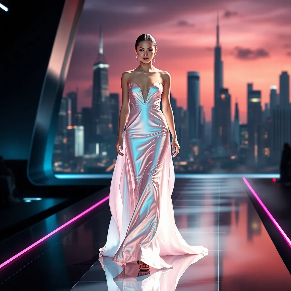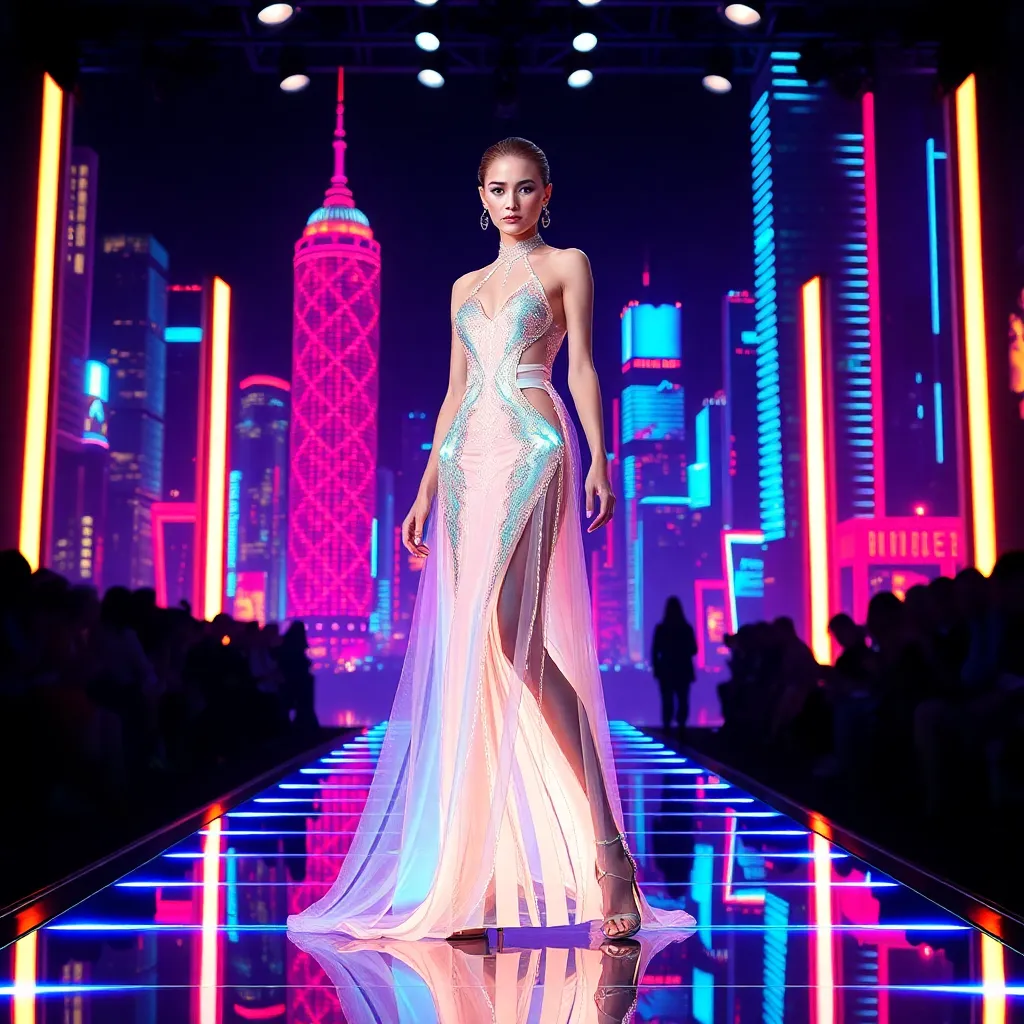 Design a futuristic high-fashion runway scene with a bold, neon-lit cityscape as the backdrop. Feature a stunning model wearing a floor-sweeping, iridescent gown with intricate LED details and towering heels. Incorporate glowing accents and dramatic poses to create a mesmerizing, otherworldly atmosphere.