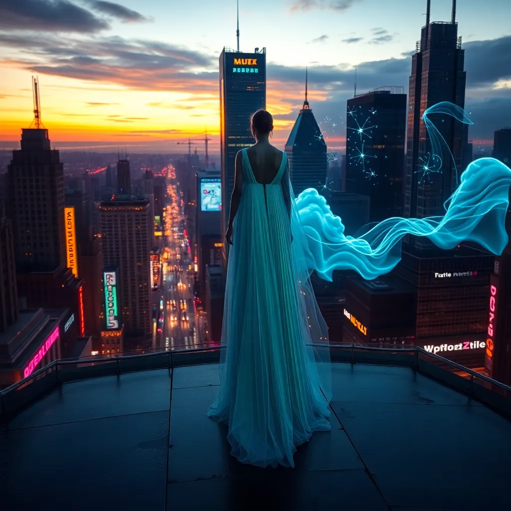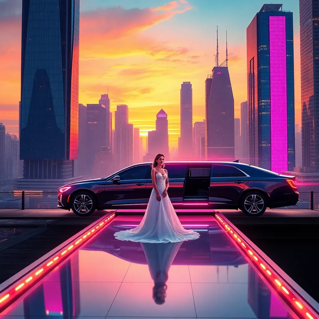 Create an image of a futuristic cityscape at sunset, with a catwalk stretching from a gleaming skyscraper to a sleek, high-tech limousine. The city's neon lights are reflected in the limousine's tinted windows, and a stunning model in a flowing evening gown is posing on the catwalk, surrounded by a halo of light.
