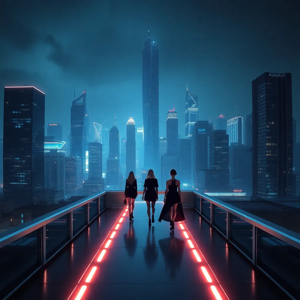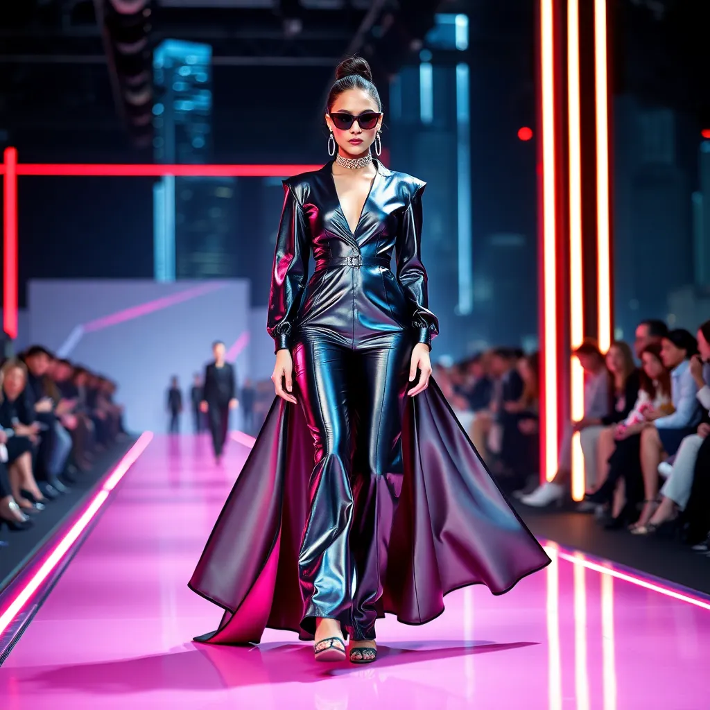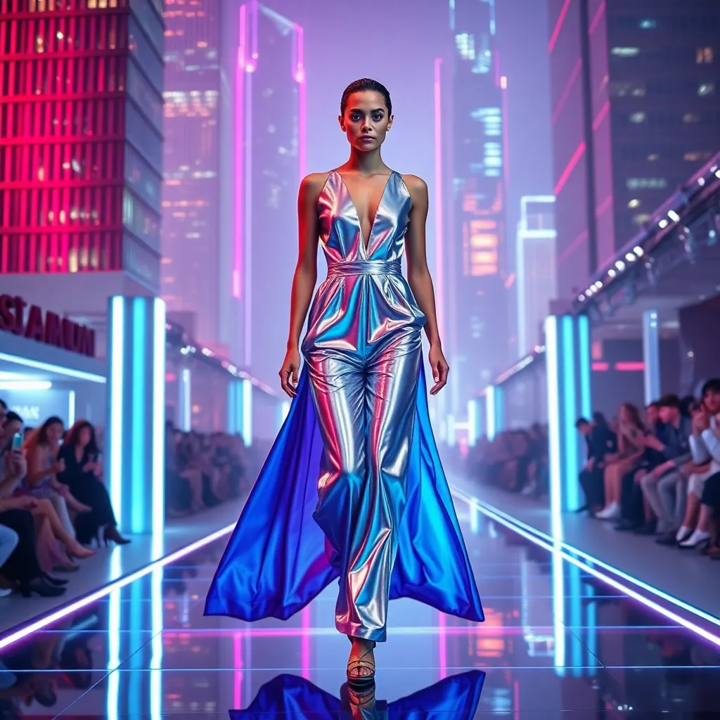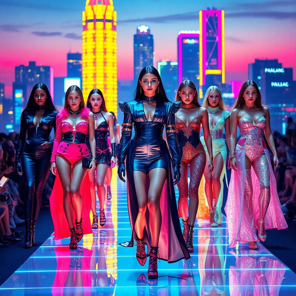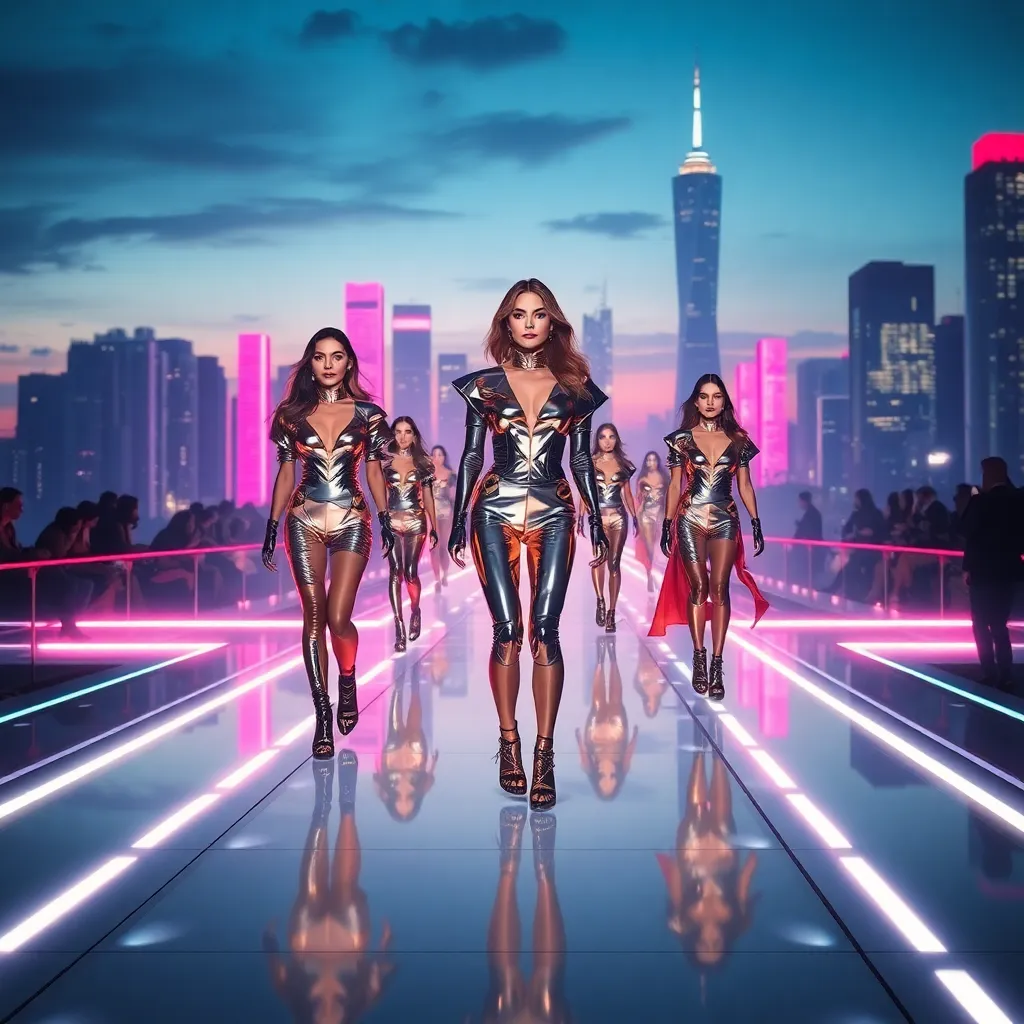 Imagine a futuristic cityscape at sunset, with a sleek, neon-lit catwalk stretching across the rooftop of a towering skyscraper. A crowd of stylish, avant-garde models in bold, metallic outfits strut down the runway, surrounded by holographic projections and pulsing lights. Capture the vibrant energy of this futuristic fashion show.