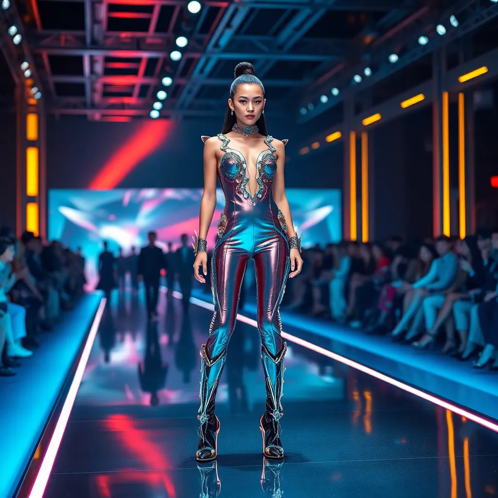 Design a futuristic catwalk for a high-end fashion show. Incorporate sleek, metallic accents, neon lights, and a dramatic backdrop. Feature a model walking down the runway in a stunning, avant-garde outfit, complete with intricate details and a bold, eye-catching color scheme. Capture the energy and excitement of the moment.