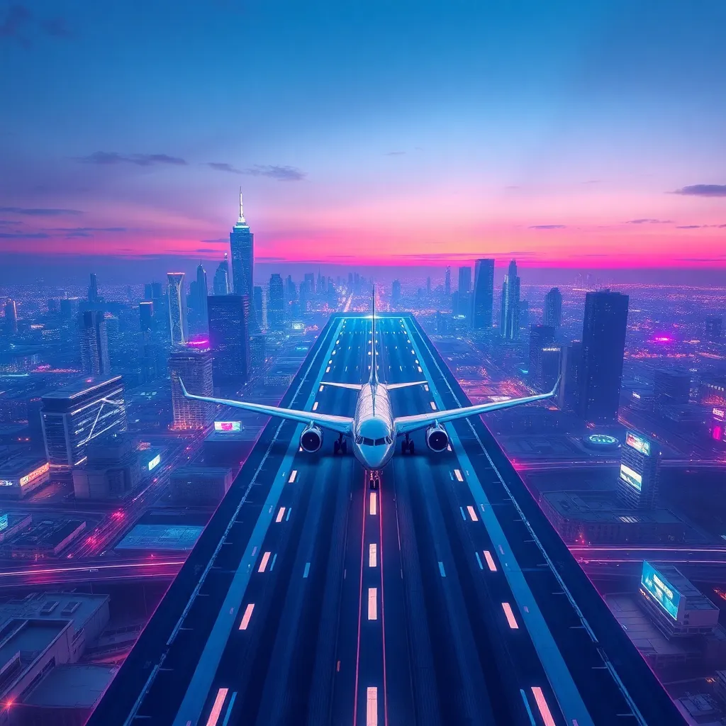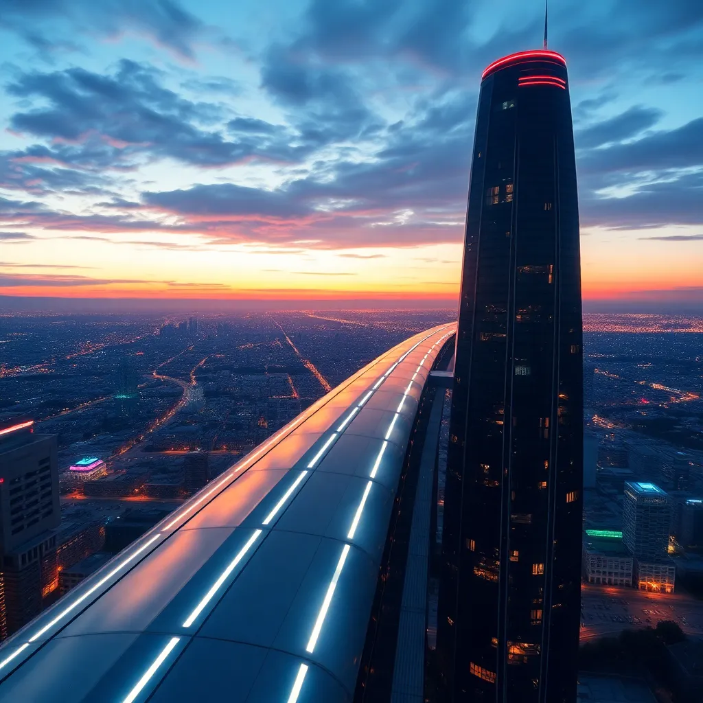 Imagine a futuristic cityscape at dusk, with a gleaming skyscraper in the foreground and a sprawling metropolis unfolding in the distance. A sleek, silver bullet-shaped runway stretches from the building's rooftop to the horizon, illuminated by neon lights that pulse with an otherworldly energy. What secrets lie within?