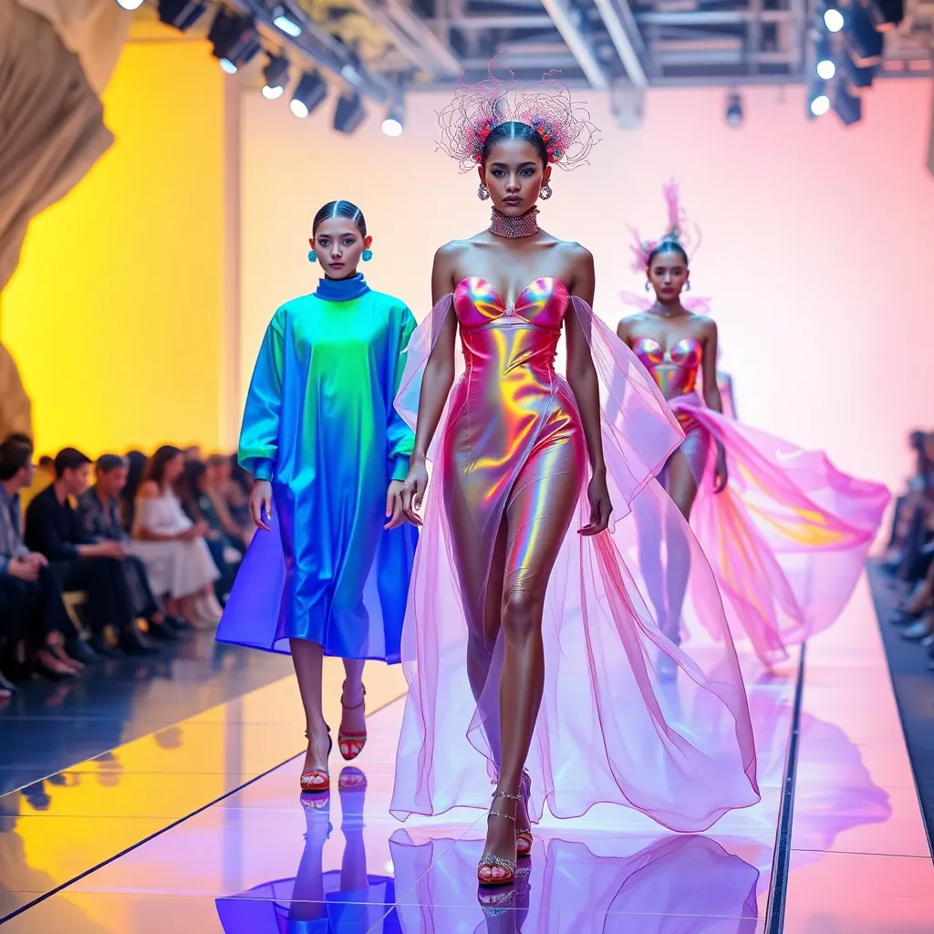 Design a futuristic runway scene showcasing a stunning, avant-garde fashion collection inspired by the intersection of technology and nature. Incorporate bold, neon hues and organic textures. The models are adorned with intricate, 3D-printed accessories and wear flowing, iridescent garments that seem to shift and change color in the light.