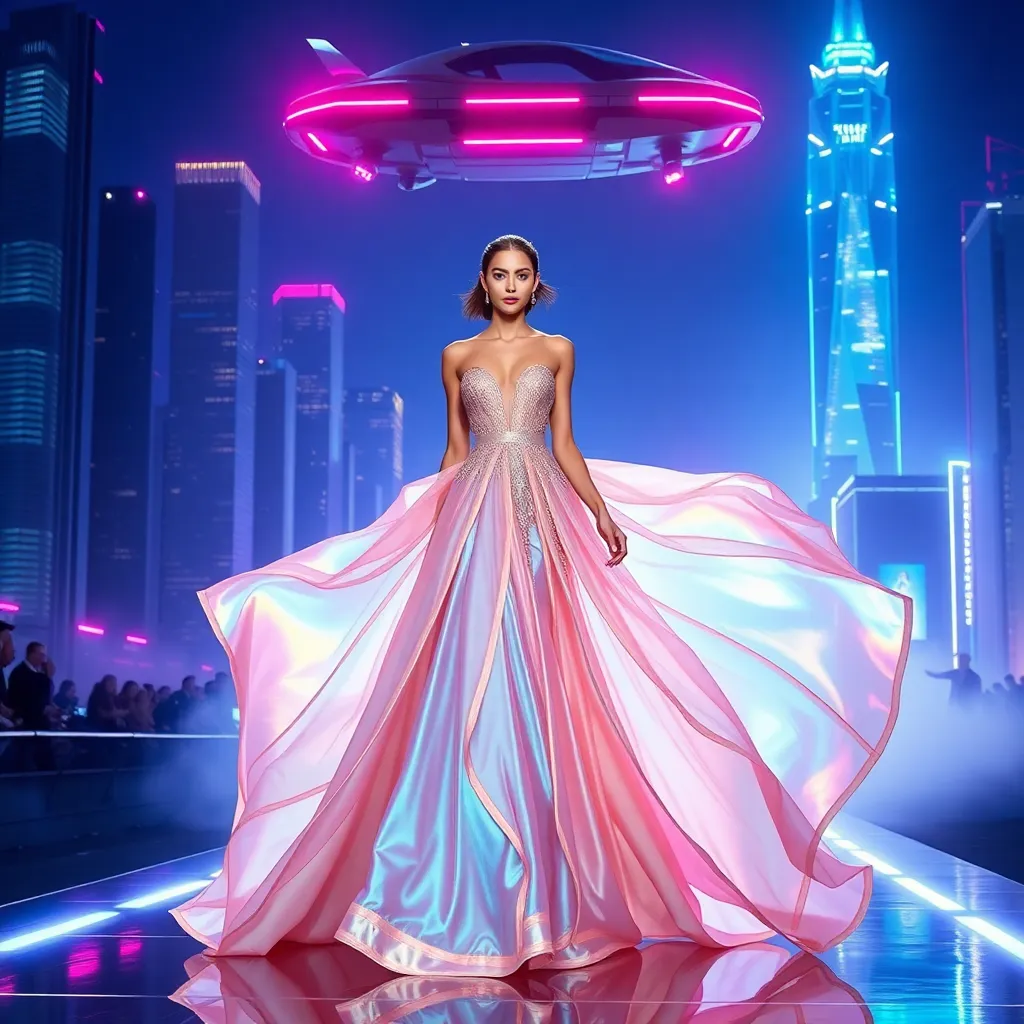Create a futuristic runway scene with a sleek, high-tech cityscape in the background. A model, dressed in a stunning, iridescent evening gown with a flowing train, walks down the catwalk with confidence and poise. Incorporate neon lights, holographic projections, and a subtle mist effect to capture the essence of a high-fashion, sci-fi world.